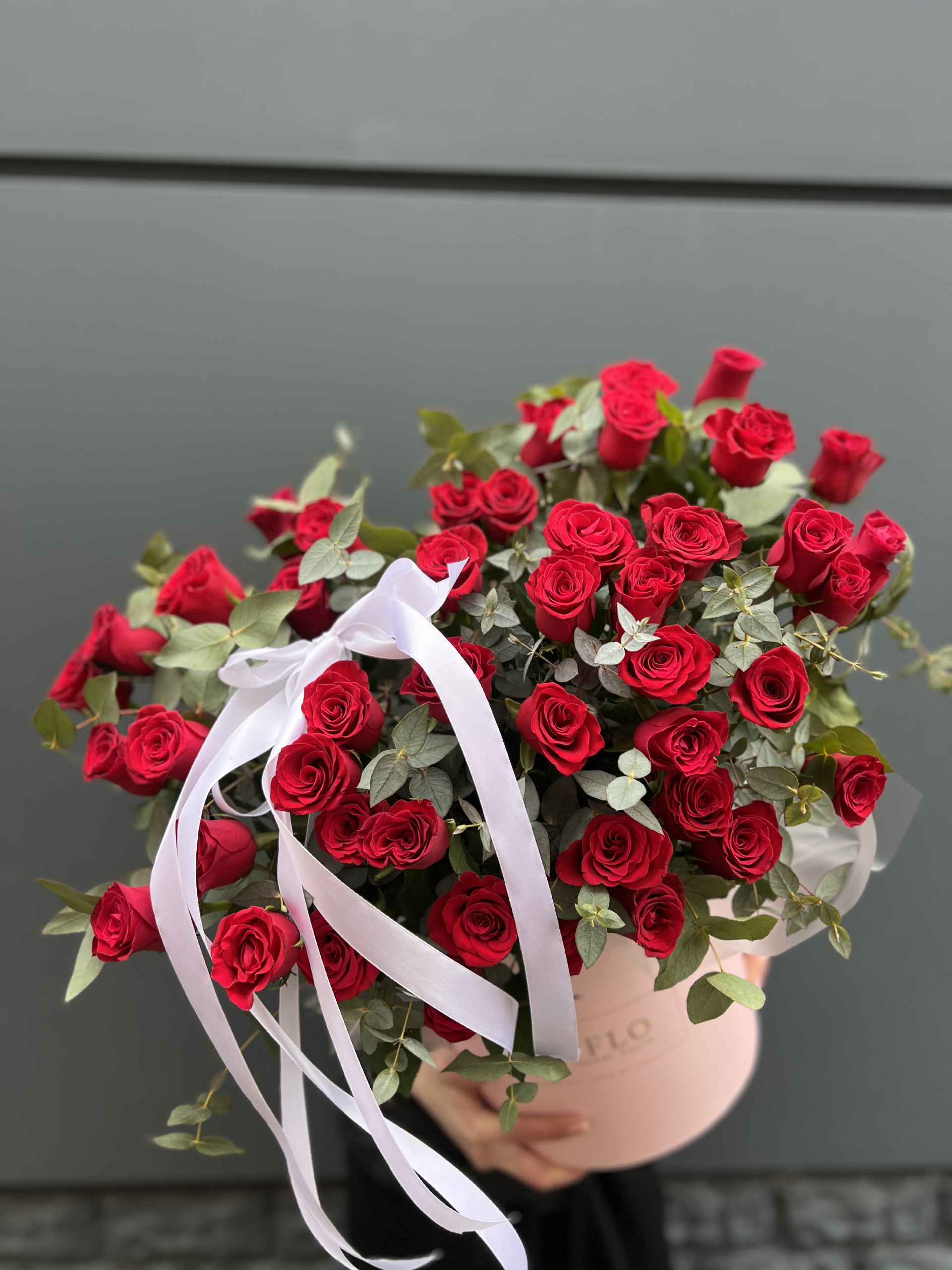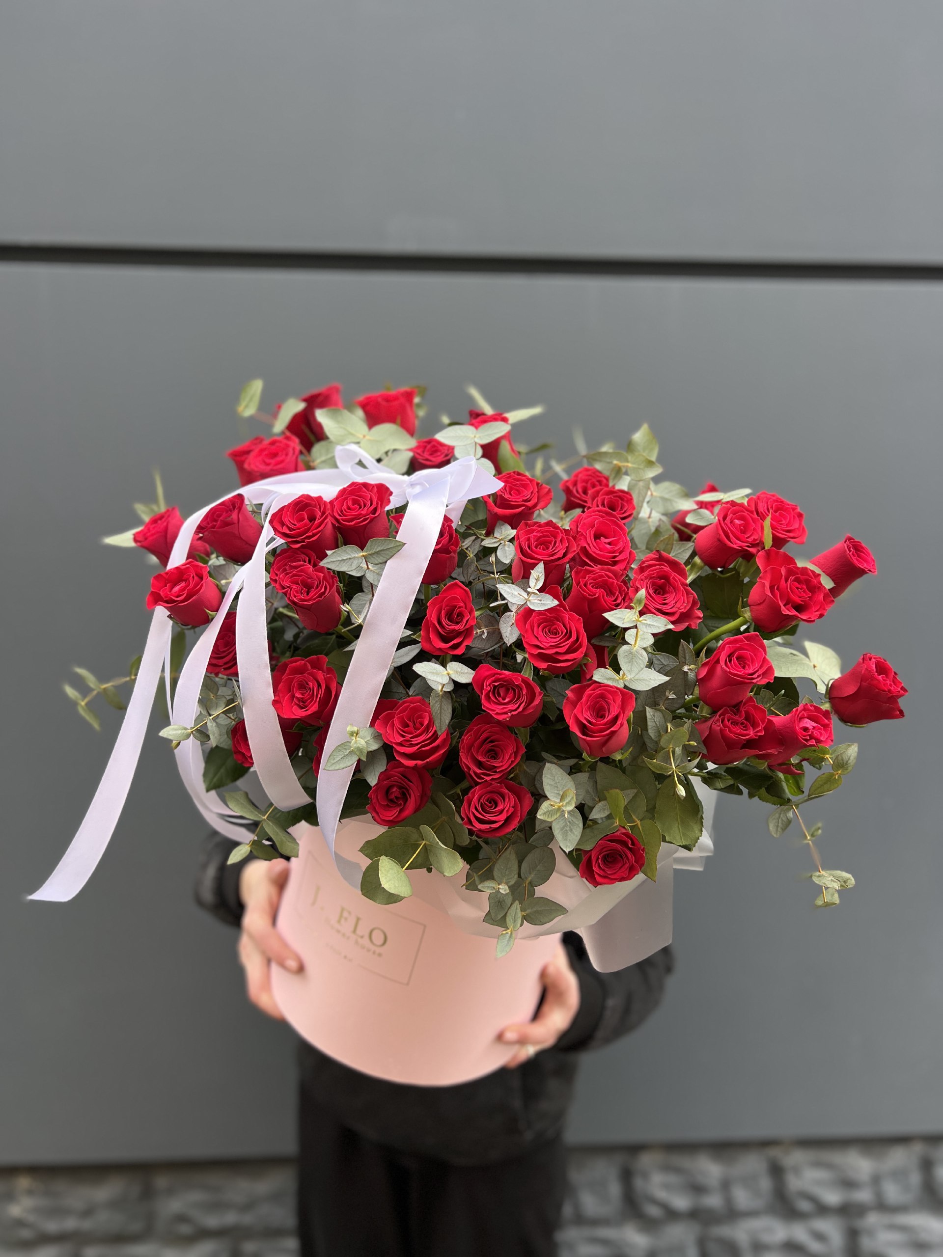 Пятнадцать вывернутых роз Джумилия раскрывают свою многослойную структуру в каждом бутоне. Эвкалипт обрамляет композицию, подчёркивая фактуру лепестков.