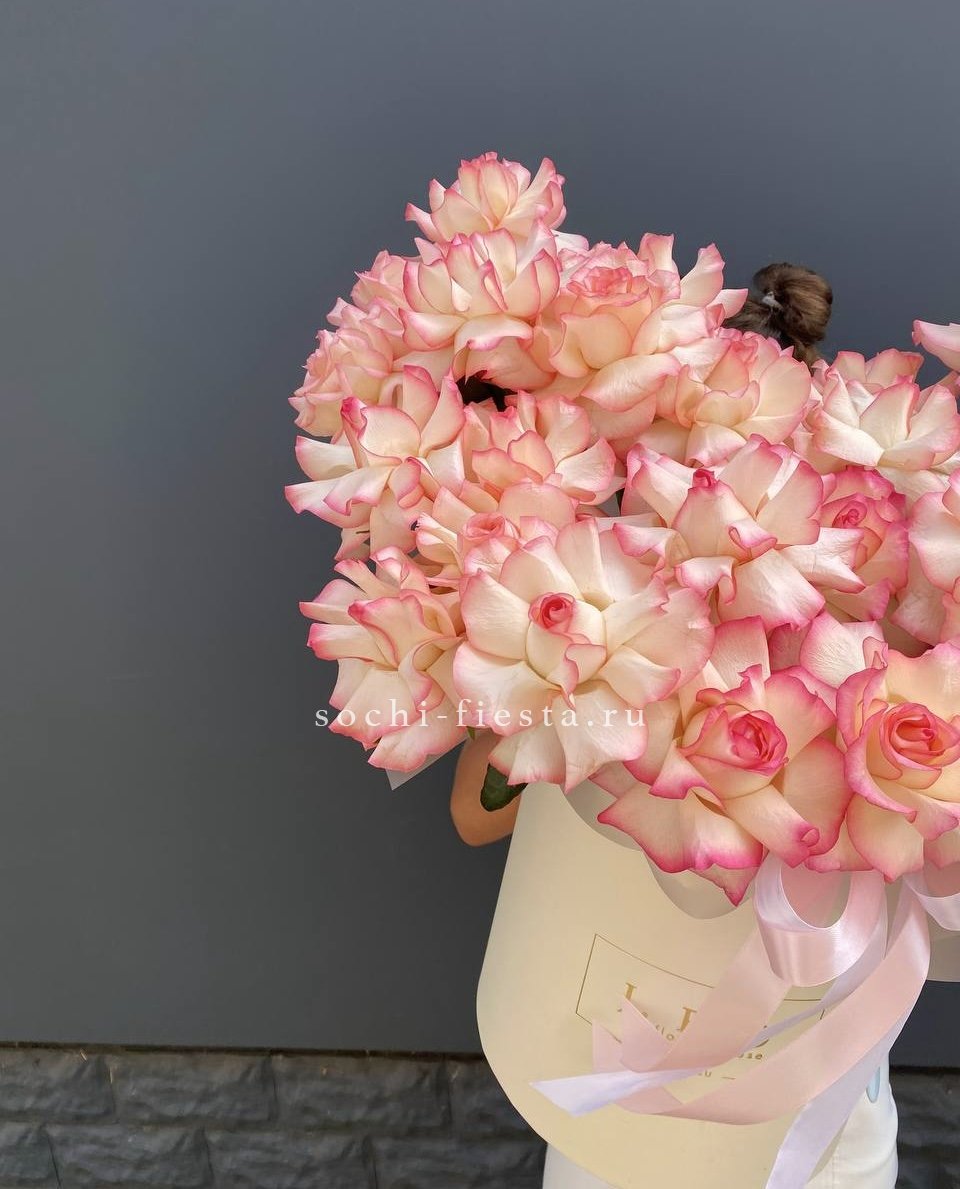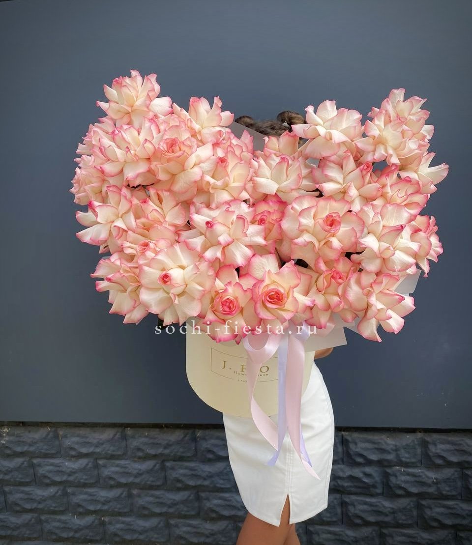 Тридцать пять белых роз образуют объемную композицию с выразительным силуэтом. Светлая упаковка поддерживает воздушность и графичность линий.