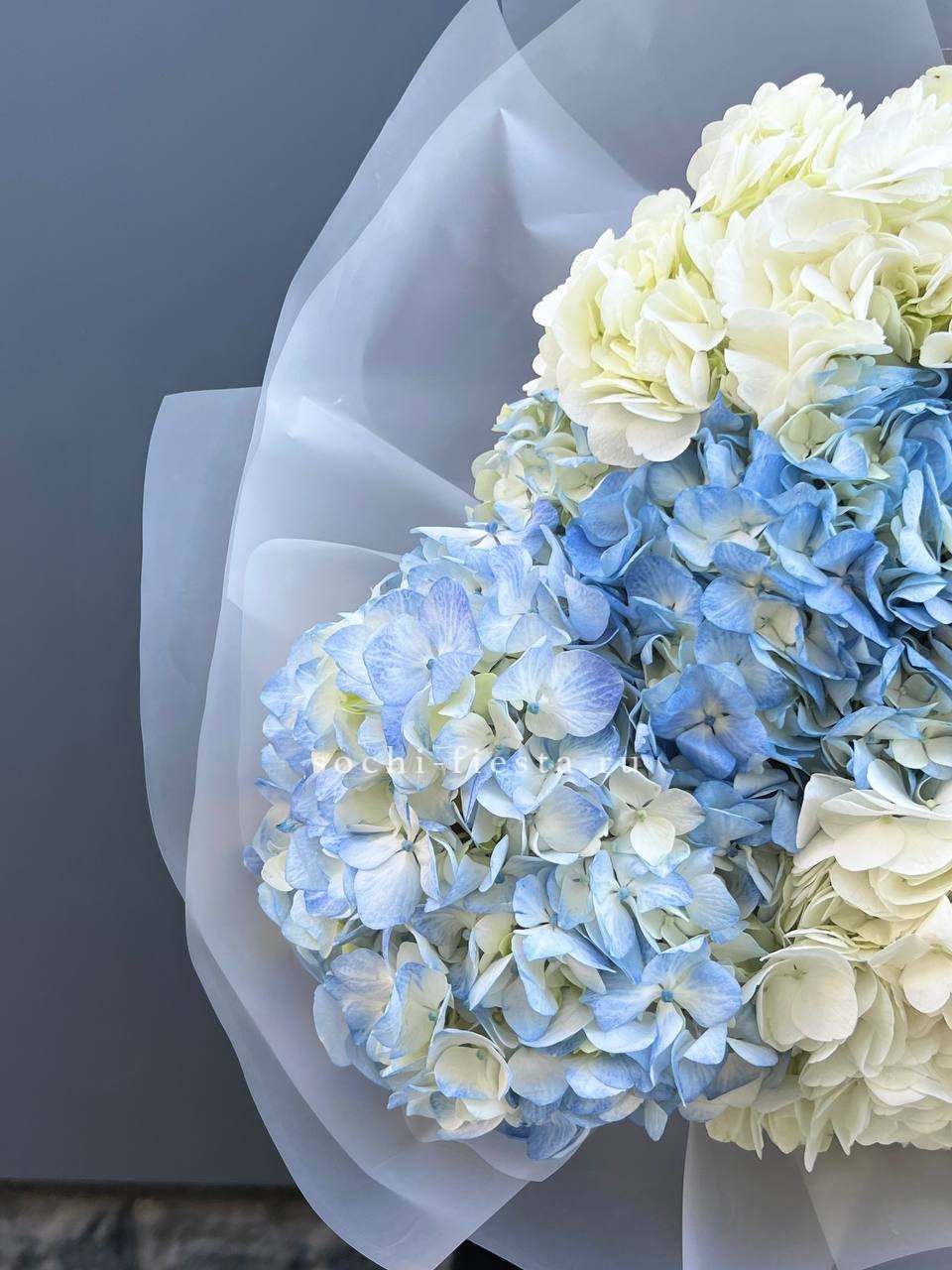 Воздушная палитра белого с голубыми переливами дарит ощущение прохлады и свежести. Пять соцветий гортензии образуют мягкую композицию, где каждый оттенок перетекает в другой, создавая глубину.