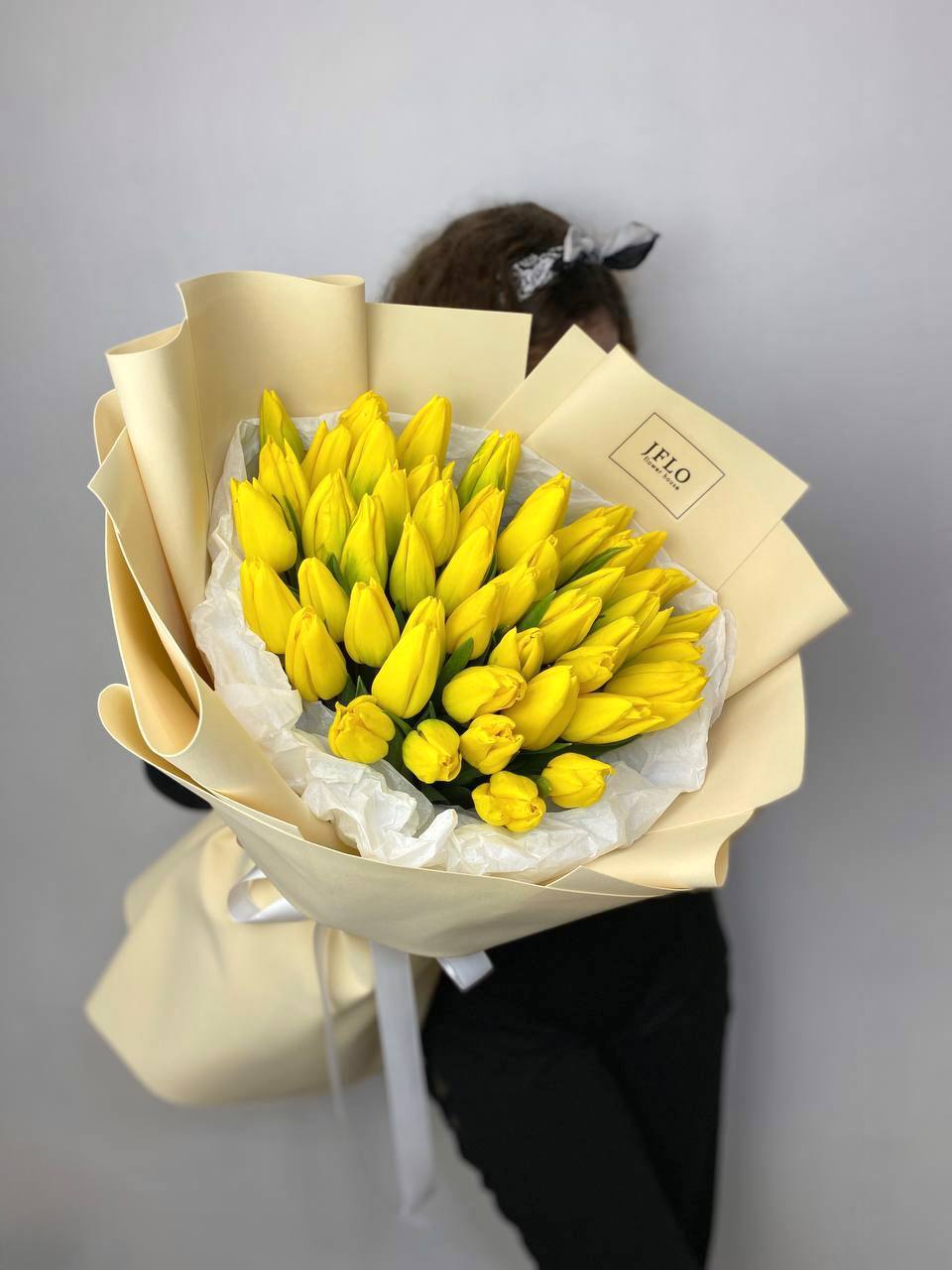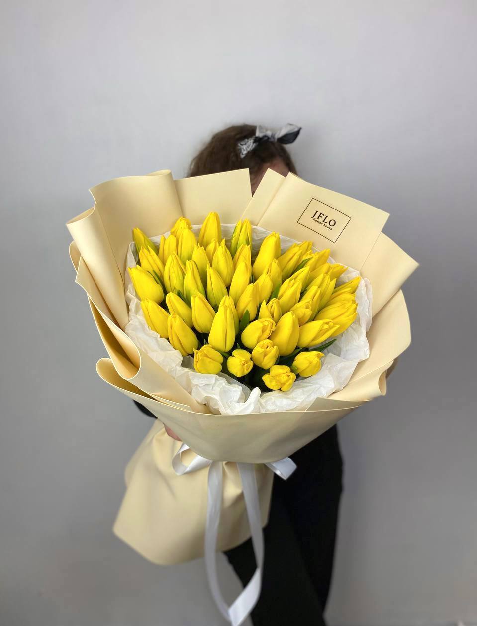Солнечная волна из пятидесяти одного жёлтого тюльпана заполняет пространство светом и теплом. Плотная сборка бутонов образует яркое цветовое пятно, которое мгновенно приковывает внимание.