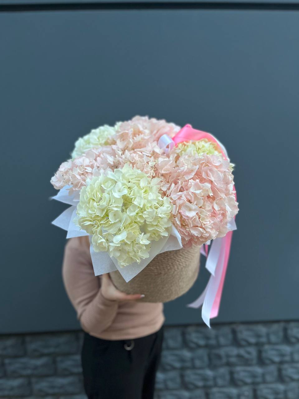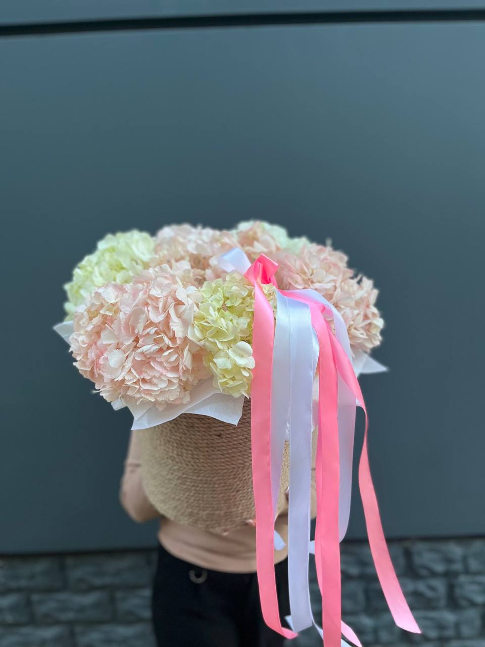 Семь пышных шапок гортензий собраны в природном джутовом кашпо. Плотные соцветия создают облачную текстуру, где каждый бутон дополняет общий объем. Композиция готова к размещению на столе или комоде без дополнительных усилий.