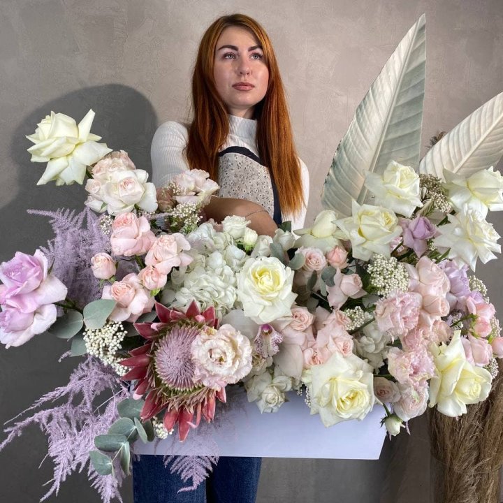 Авторские букеты гиганты в Кирове — формат для тех событий в жизни города, когда обычного букета недостаточно. Юбилей 50 лет, свадьба, открытие бизнеса, значимое корпоративное поздравление — именно к таким поводам клиент заказывает гигантский авторский букет, который невозможно не заметить. Флорист в Кирове создаёт авторские букеты гиганты из 101 и более роз, пионовые гиганты в сезоне, корзины-гиганты для торжественных вручений. Именно масштаб флористического жеста делает момент незабываемым для получателя и всех присутствующих.