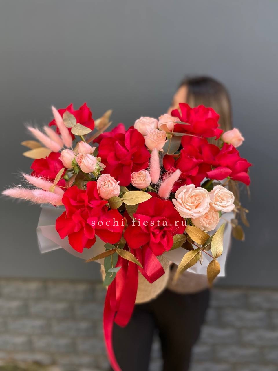 Сорок пять французских роз с вывернутыми лепестками образуют плотную композицию в плетёной корзине. Джумилия раскрывается широко и создаёт объёмную фактуру с глубокими переливами оттенков.