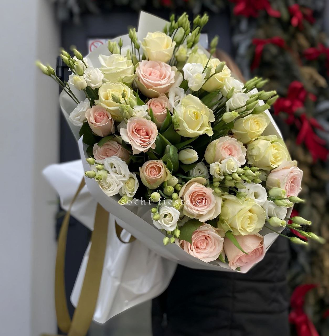 Букет выглядит объемно и держит форму благодаря плотной сборке.