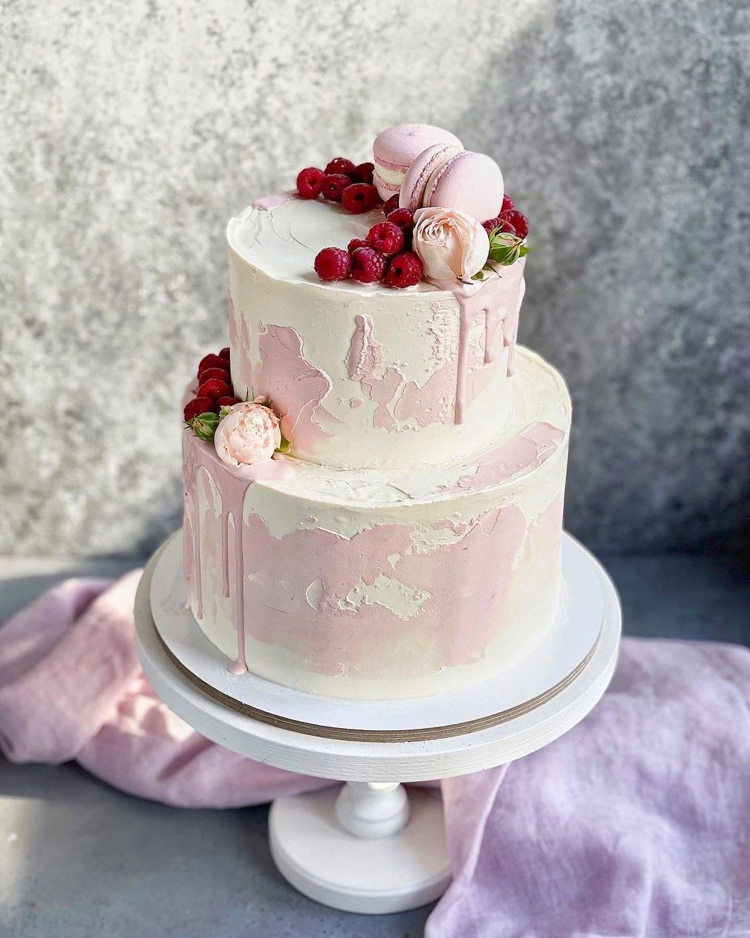 Пудровые розы и кустовые соцветия собраны с диантусами и озотамнусом в округлую форму. Шесть макаронс завершают композицию и создают ощущение домашнего уюта.