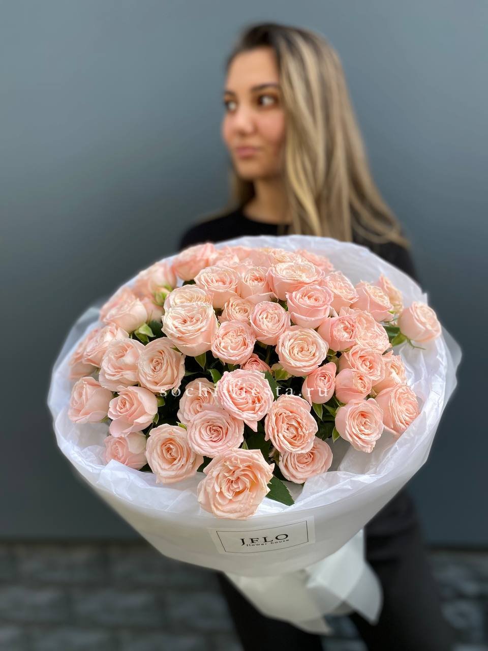 Тринадцать стеблей кустовых роз Бомбастик собраны в пышную охапку. Множество бутонов на каждой ветке создают впечатление воздушного облака с мягкими переходами оттенков.