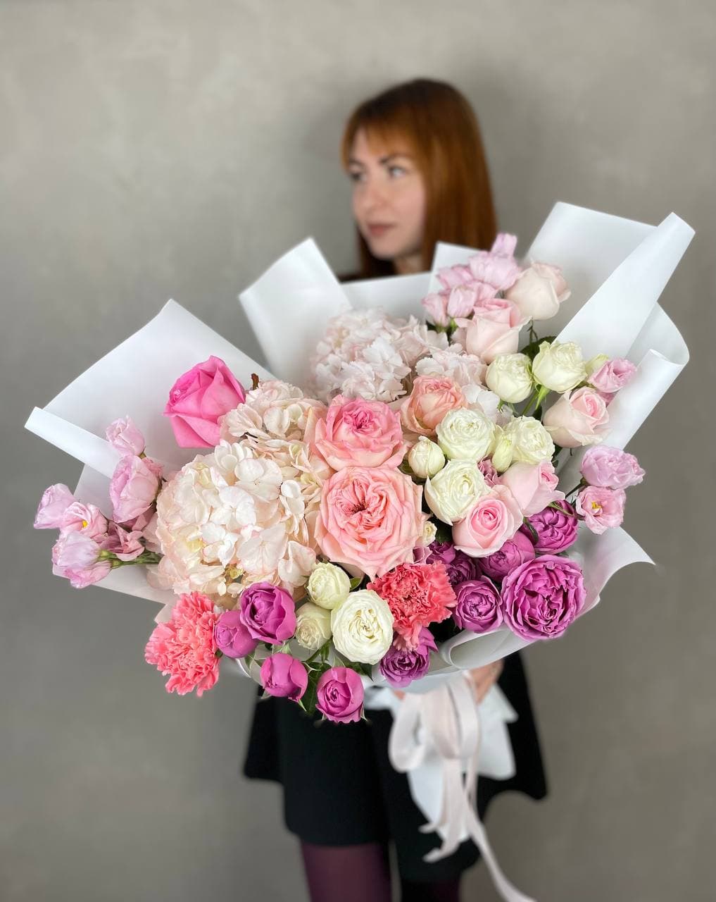 Розовые розы раскрываются среди воздушных соцветий гортензии и мелких бутонов диантуса. Озотамнус добавляет композиции лёгкость и объём. Букет собран плотно и держит форму без лишних деталей.