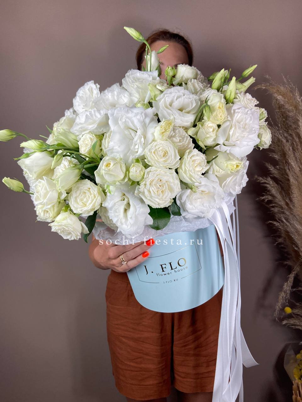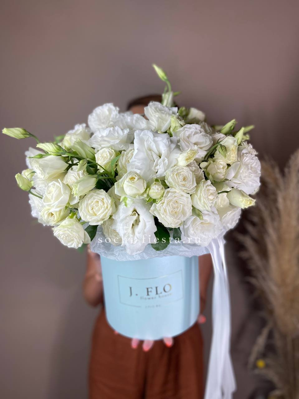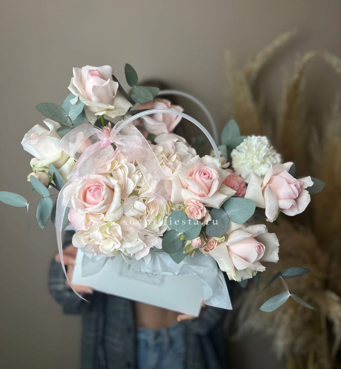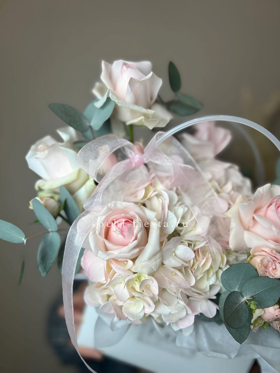 Пышная гортензия соседствует с крупными бутонами роз и многослойной эустомой. Веточки эвкалипта придают свежесть всей композиции. Букет с выразительным объемом и природной гармонией форм.