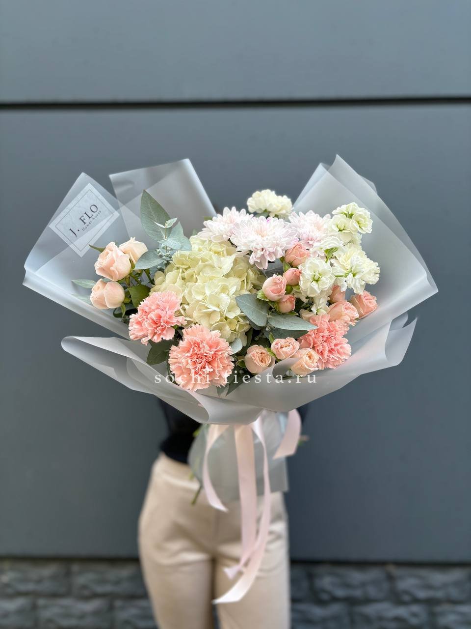 гортензия, диантусы, маттиола или замена в несезон, бомбастик, хризантема в воздушном оформлении.