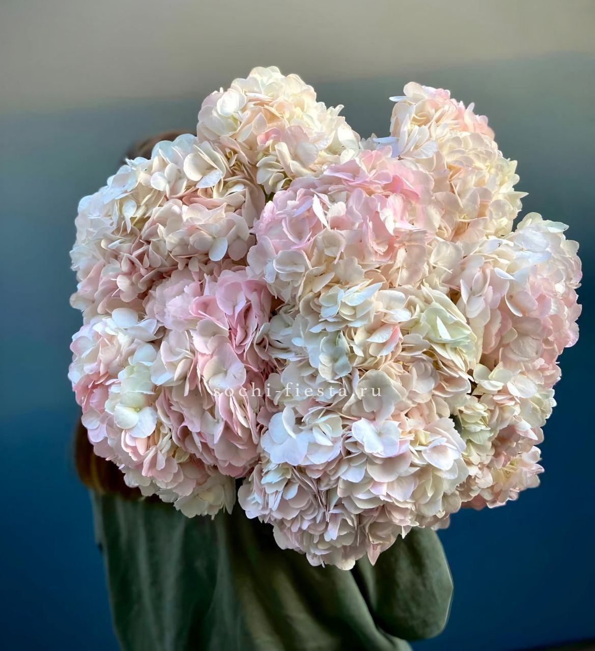 гортензия, лента, зелень по наличию, дизайнерская упаковка.