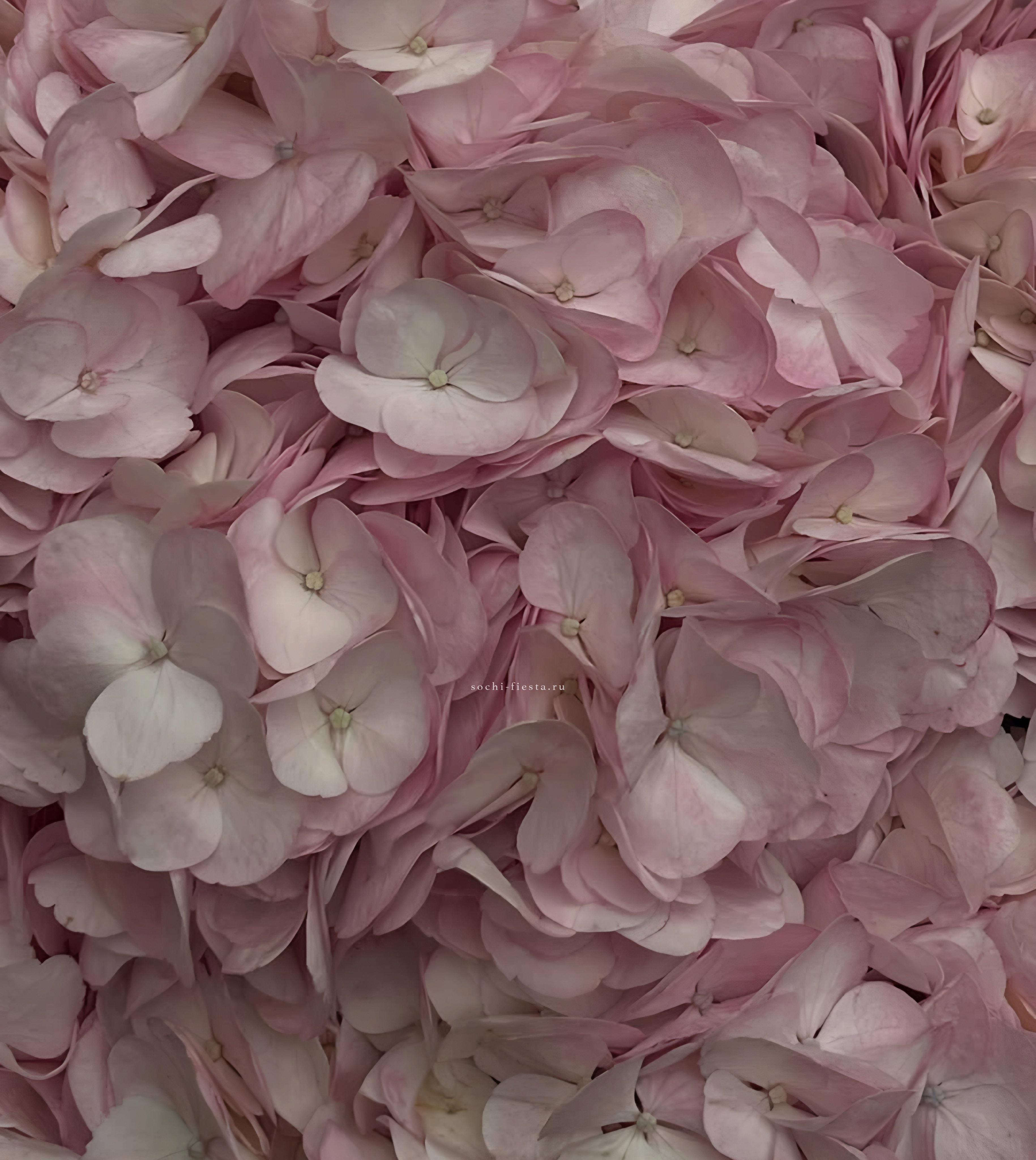 Девять пышных соцветий розовой гортензии собраны в объёмный букет с мягким градиентом оттенков. Каждая головка раскрыта полностью, создавая плотное облако лепестков.