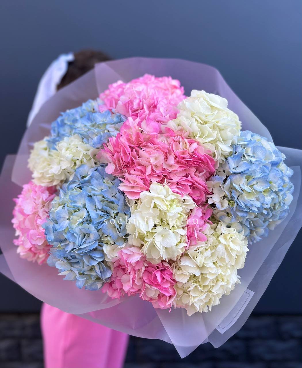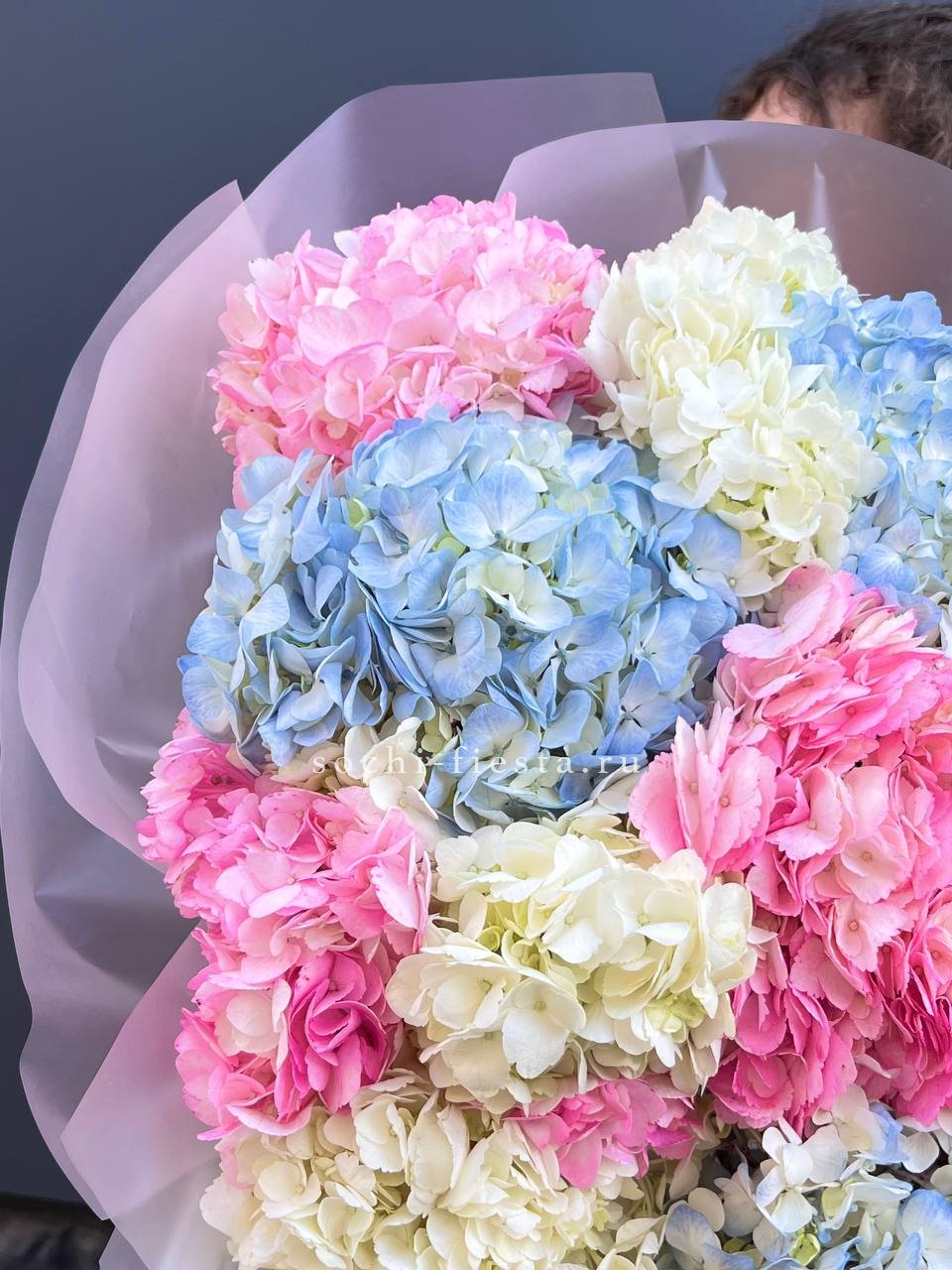 гортензия розовая 9шт., лента, дизайнерская упаковка. Цвет гортензий может незначительно отличаться.