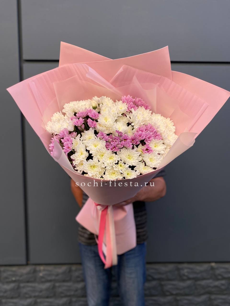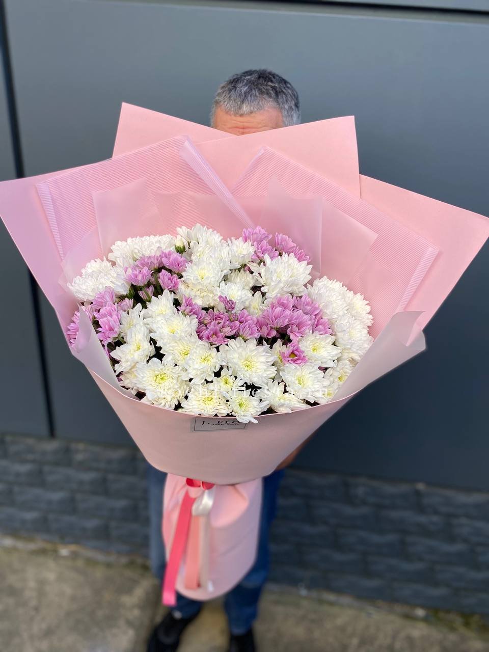Семь веток кустовой хризантемы обрамлены лавандовым фоамираном, который мягко перекликается с оттенками бутонов. Композиция собрана свободно, сохраняя естественную пластику стеблей и живость форм.