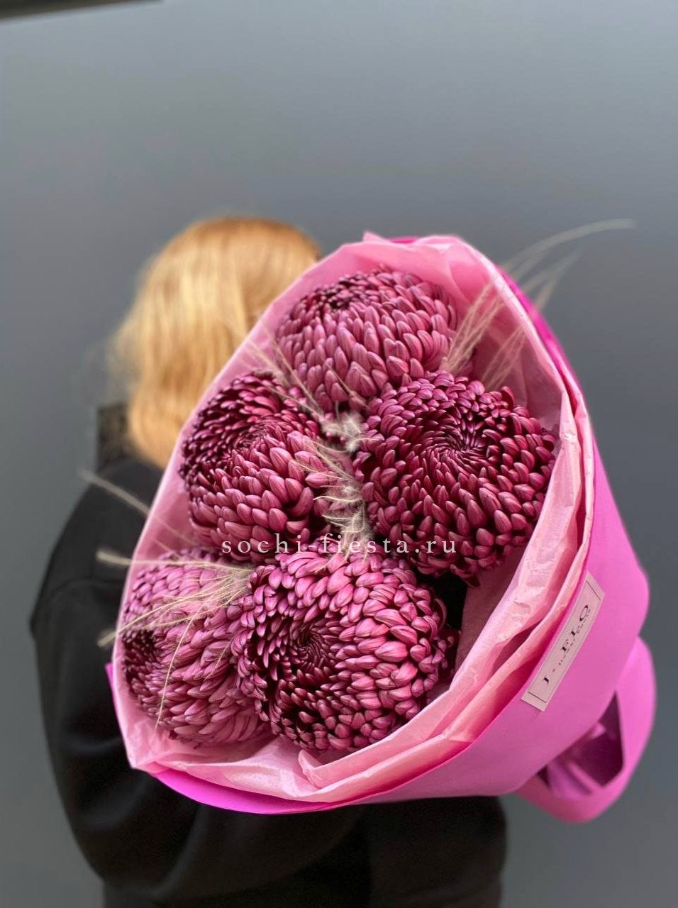 хризантемы Бигуди - 5, стифа (аналог по сезону),  лента, дизайнерская упаковка.