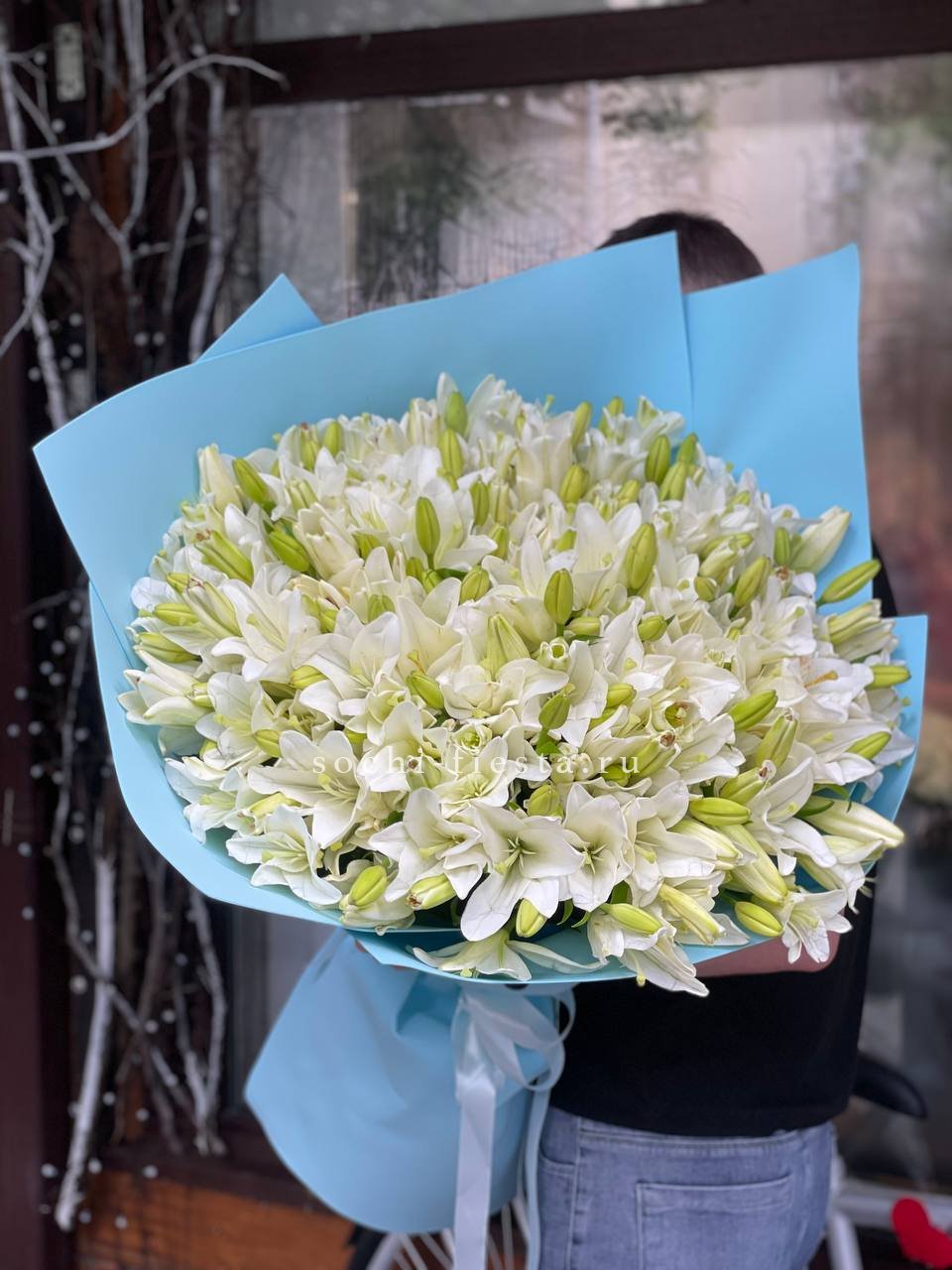 Пятьдесят один стебель лилий в плотной сборке. Бутоны раскрываются постепенно, продлевая жизнь композиции на долгие дни. Высокий букет с выразительным присутствием в любом пространстве.