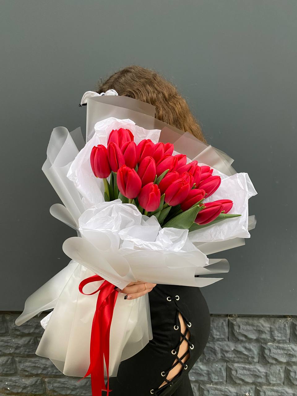 Девять тюльпанов в розовой гамме собраны в лаконичную композицию с мягким обрамлением. Бутоны держат форму и создают спокойный цветовой акцент в любом пространстве. Монобукет для тех, кто ценит простоту без лишних деталей.
