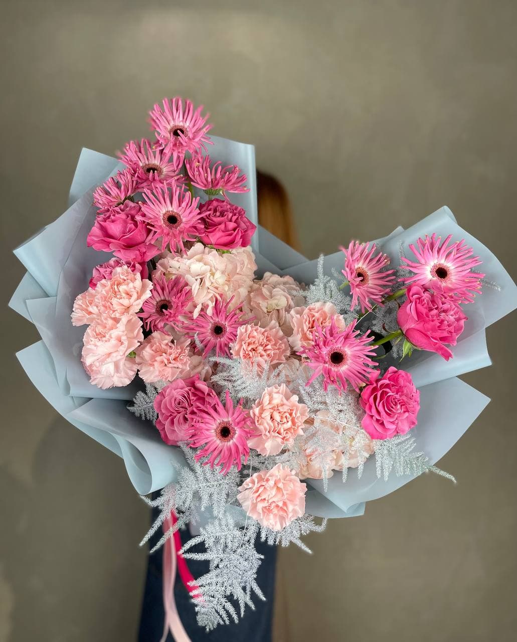 Пионовидные розы и крупные соцветия гортензии создают объёмную текстуру с мягкими переходами оттенков. Экзотическая гербера и диантус добавляют графичности, а воздушный аспарагус разбивает плотность композиции лёгкими штрихами.