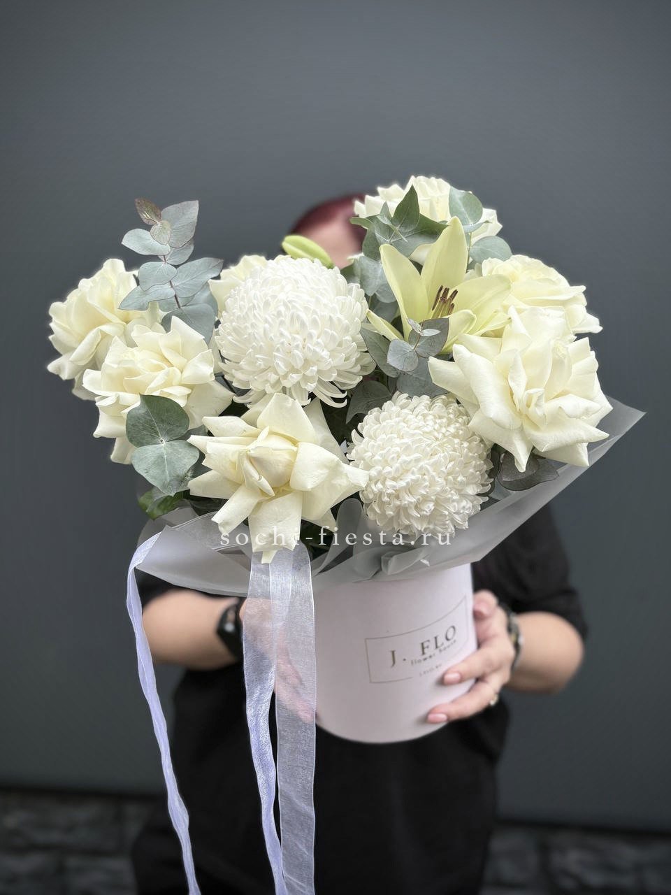 лилии, диантусы, хризантемы, эустома, статица, эвкалипт, цилиндр.