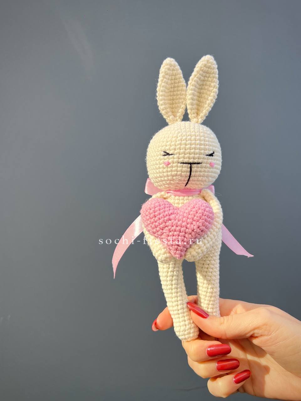 Зайка держит красное сердце в лапках — готовый жест без лишних слов. Фактура плетения мягкая и объёмная. Трогательный акцент рядом с живыми цветами