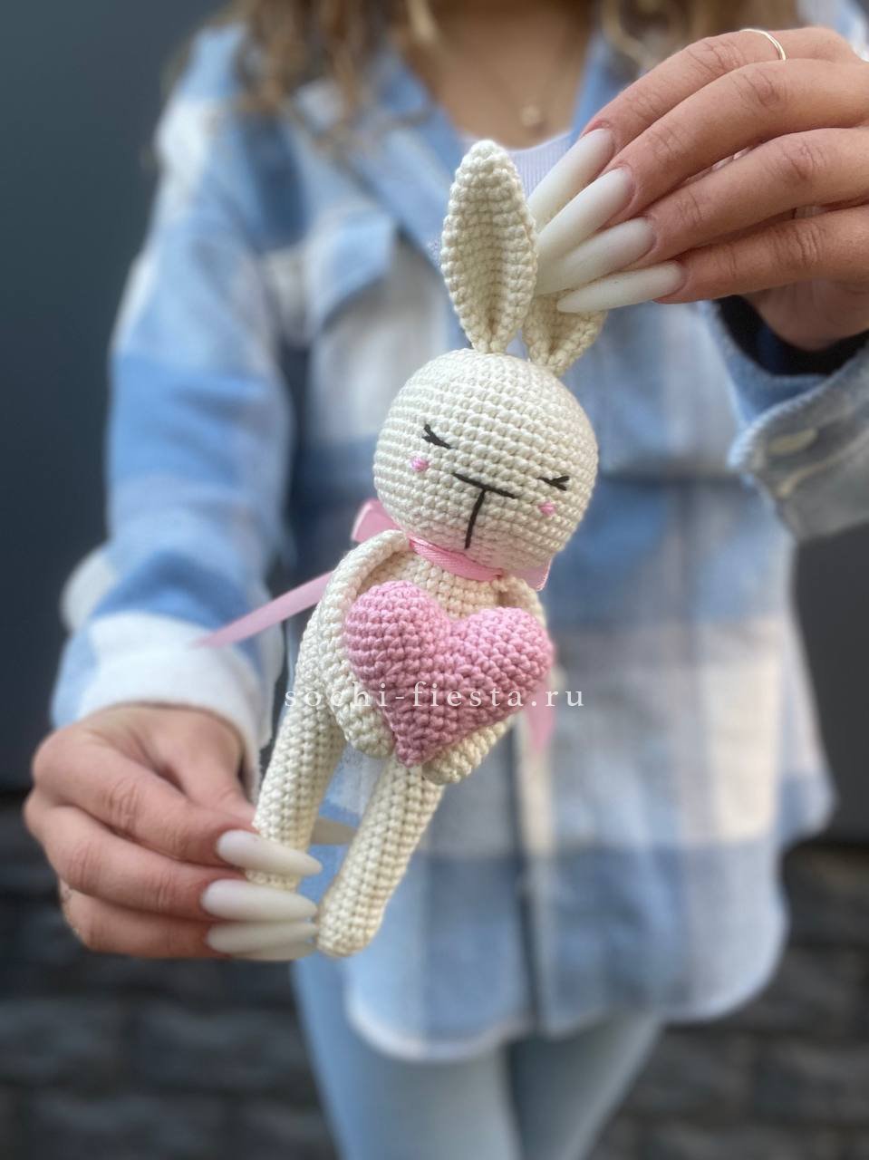 на фотографии зайка ручное плетение. Доставка данной товарной единицы бесплатна при условии её заказа с цветами.