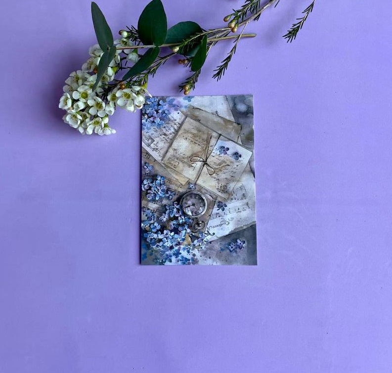 Открытка Время с лаконичным графичным рисунком передаёт ощущение важности момента. Ваши слова в объёме до семи предложений мы разместим на плотной бумаге.