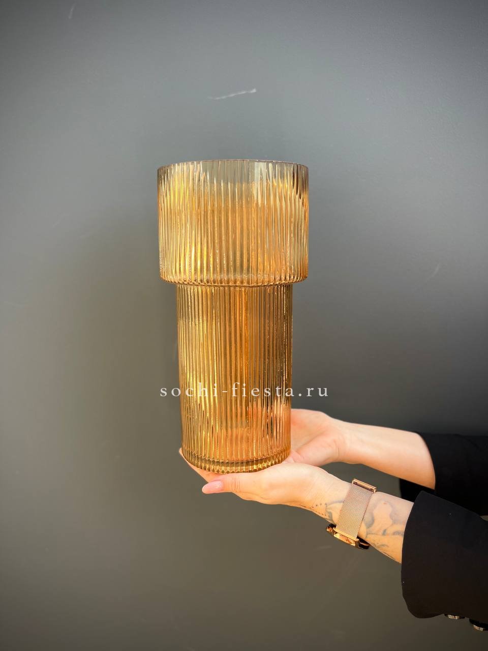 Рельефная поверхность создает игру света и визуальную глубину. Золотистое стекло меняет восприятие букета и работает как самостоятельный декоративный объект. Подходит для живых цветов и сухоцветов.