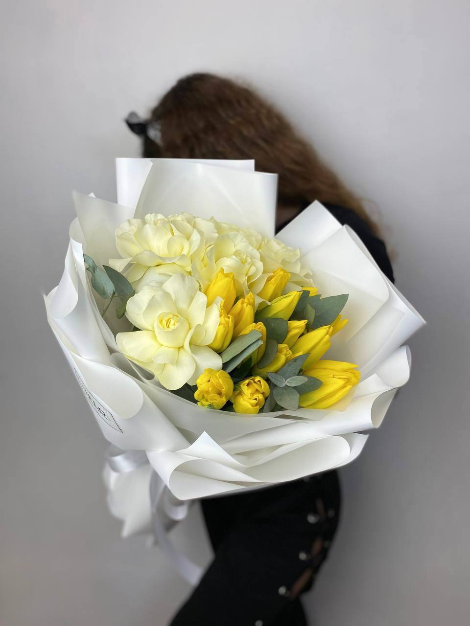 жёлтые тюльпаны, розы, эвкалипт, пленка.