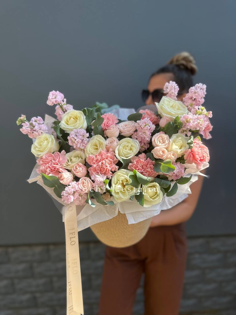 Белоснежные розы переплетаются с лиловыми нотами маттиолы и диантусов. Кустовые соцветия и эвкалипт создают воздушную текстуру в компактном джутовом обрамлении.