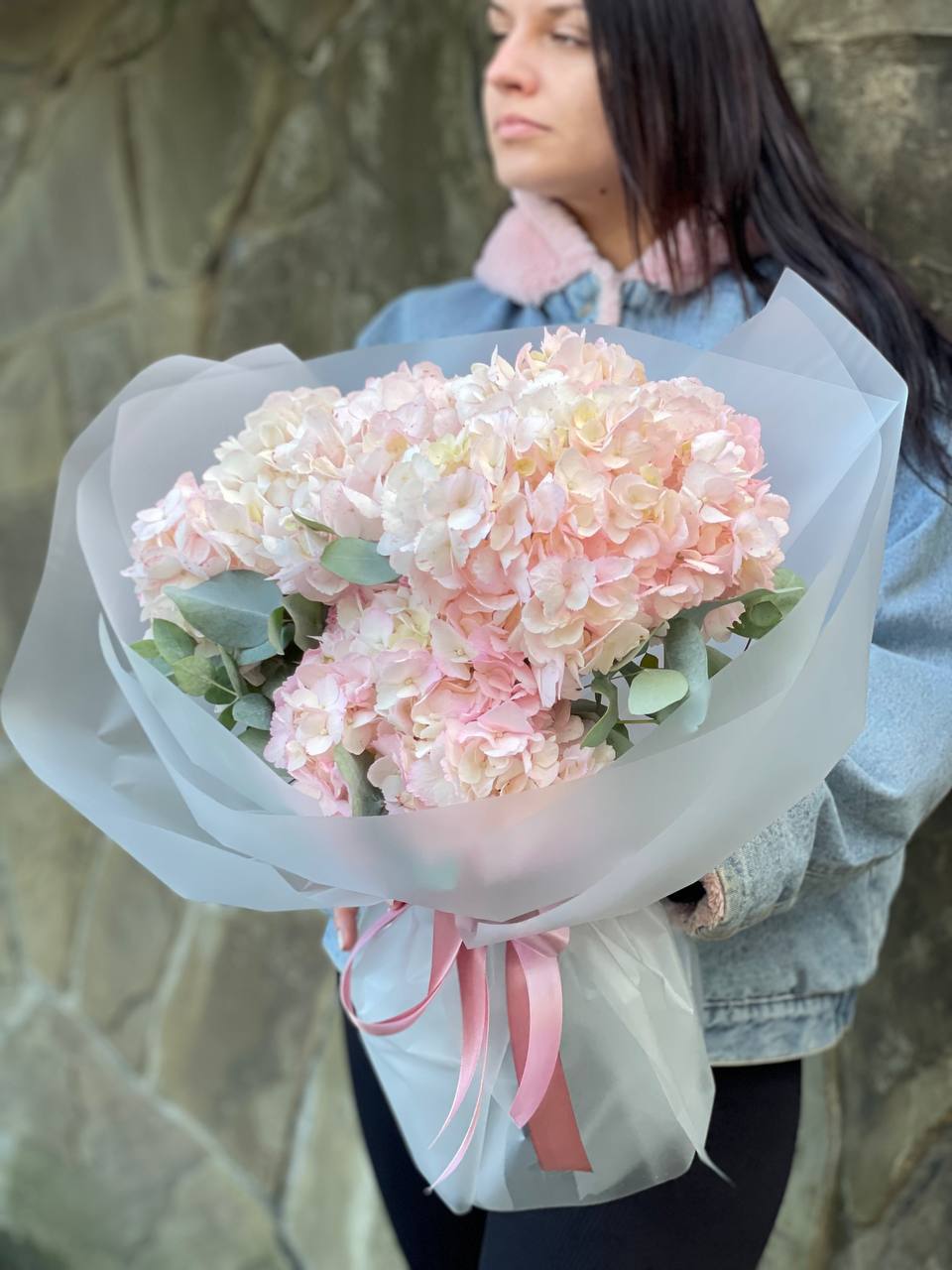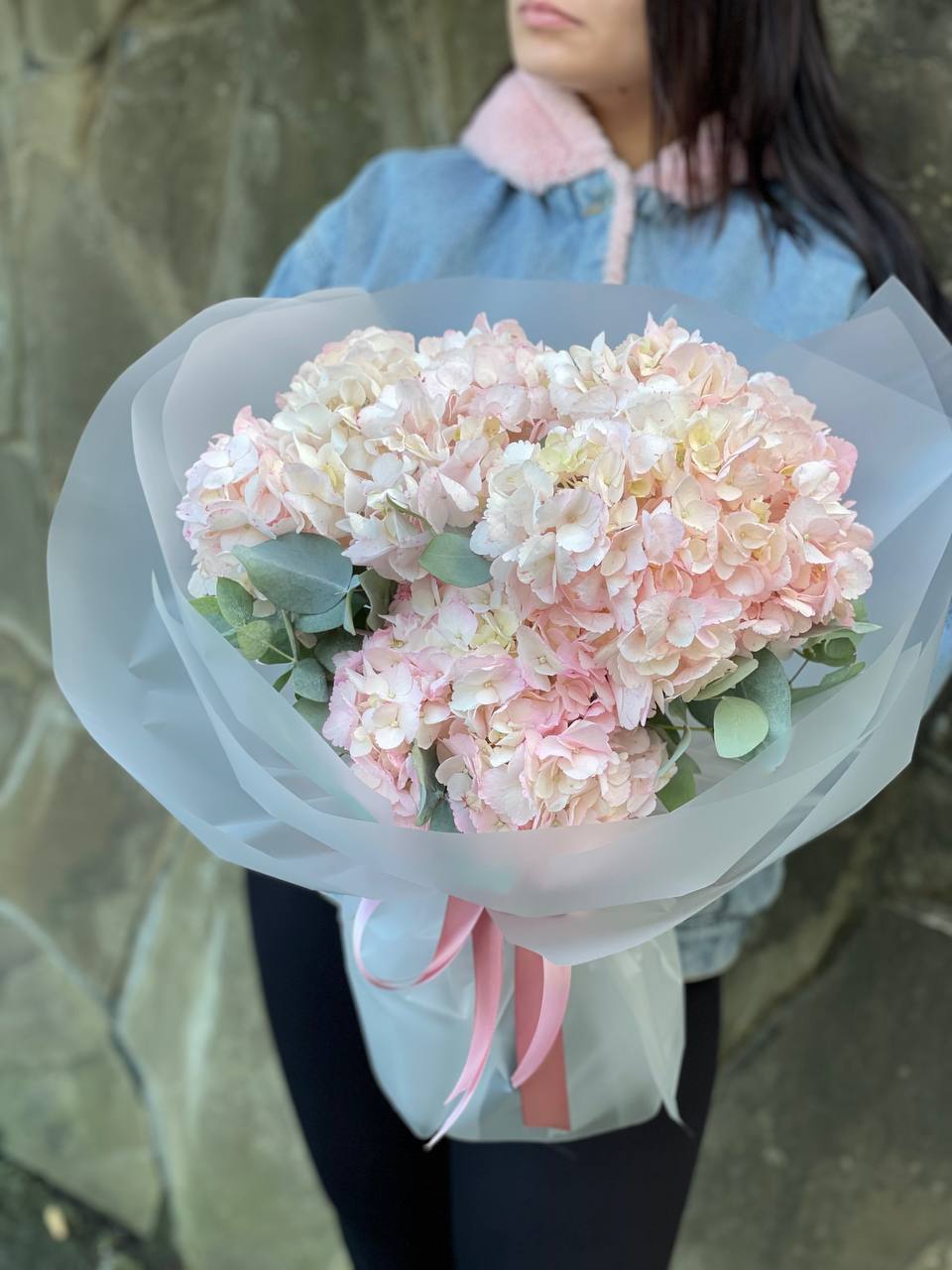 гортензия розовая, лента, дизайнерская упаковка. Цвет гортензий может незначительно отличаться.