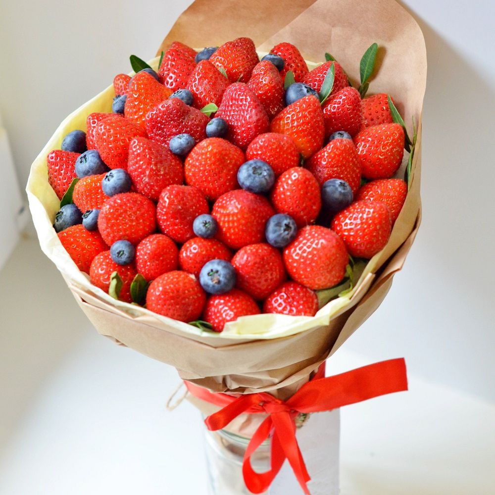 Клубника и голубика собраны в аккуратную форму, которая держится без лишних деталей. Крафтовая упаковка подчёркивает естественность подачи.