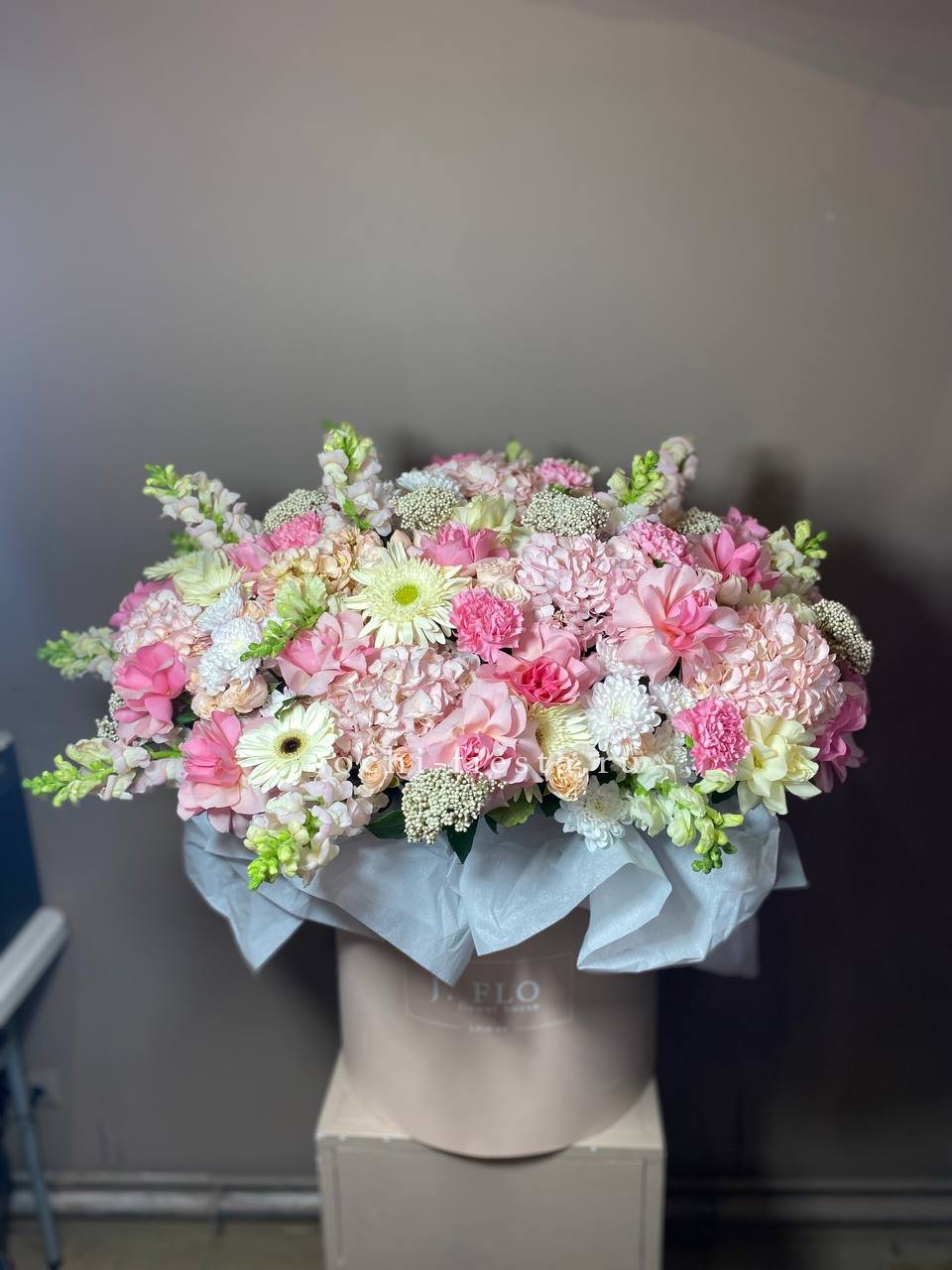 хризантемы, герберы, розы, антиринум, диантус, гортензия, бомбастик, озатамус в коробке или корзине на выбор.