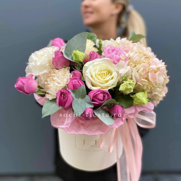Наполнение подбирается под сезон. Зимой — амариллис, розы, ранункулюсы. Весной — тюльпаны, ранункулюсы, фрезия. Летом — пионы в мае-июне, гортензия в июле-августе. Осенью — хризантемы и декоративные травы.