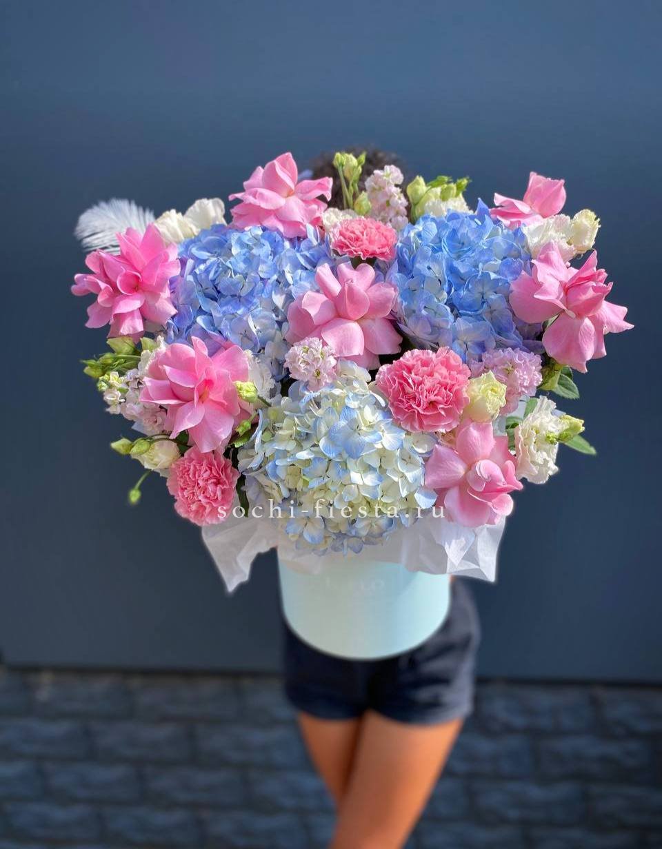 гортензия, кустовые розы, белые розы, эустома, диантусы, озатамус, цилиндр D16, эвкалипт, лента.