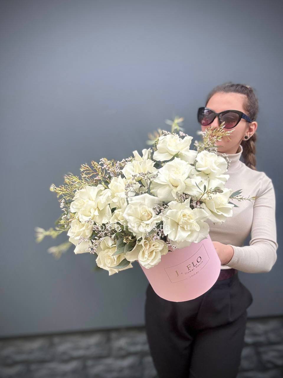 вывернутые белые розы, цилиндр D16, лимониум, эвкалипт,  лента, упаковка.