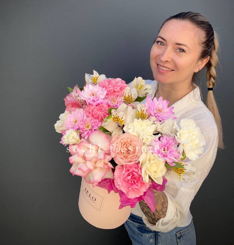 розы, альстромерии, хризантемы, диантусы, цилиндр D13,оазис, тишью.