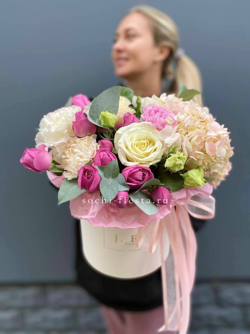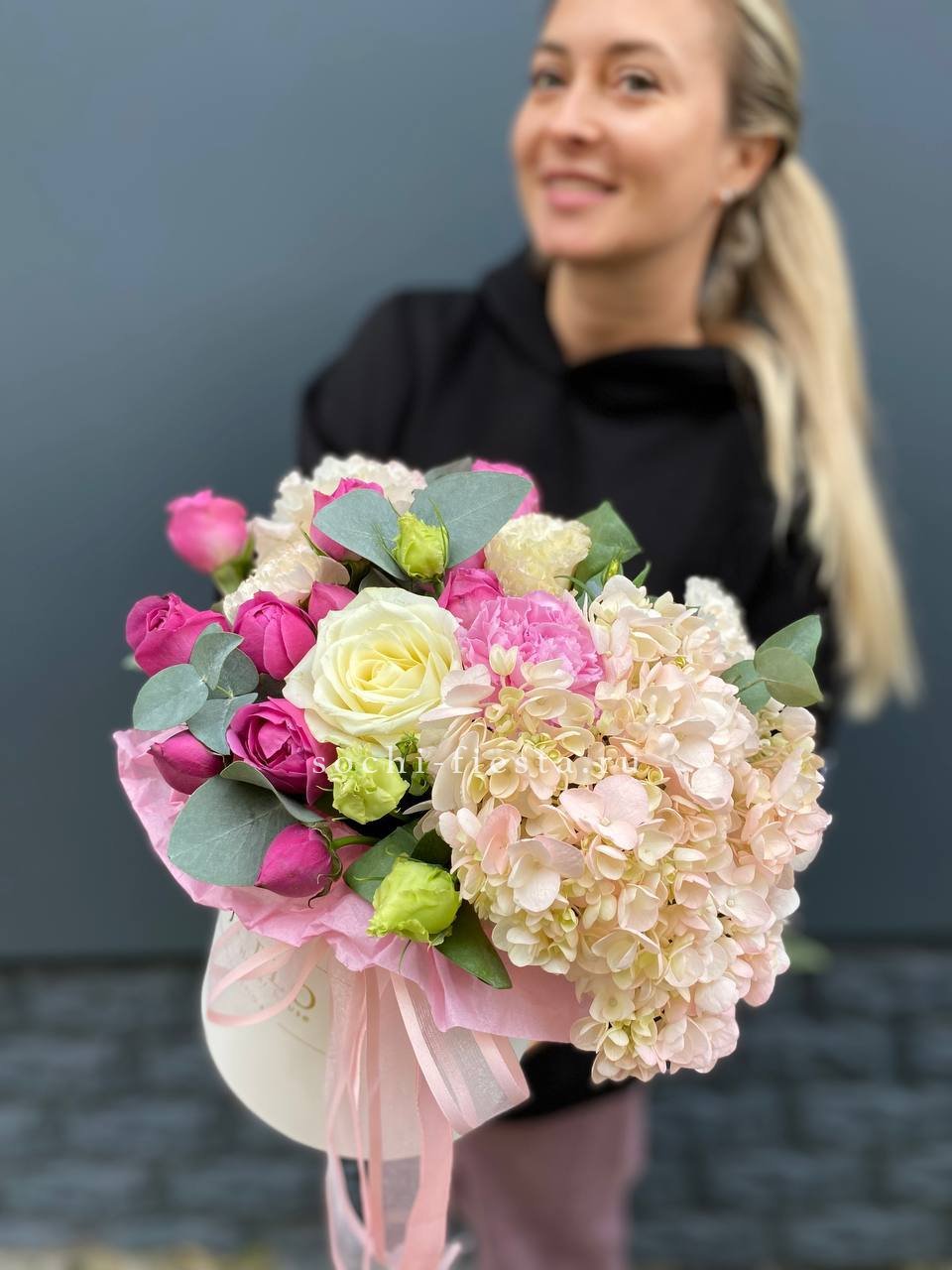 гортензии, пионовидные кустовый розы, декоративная зелень, бокс D25.