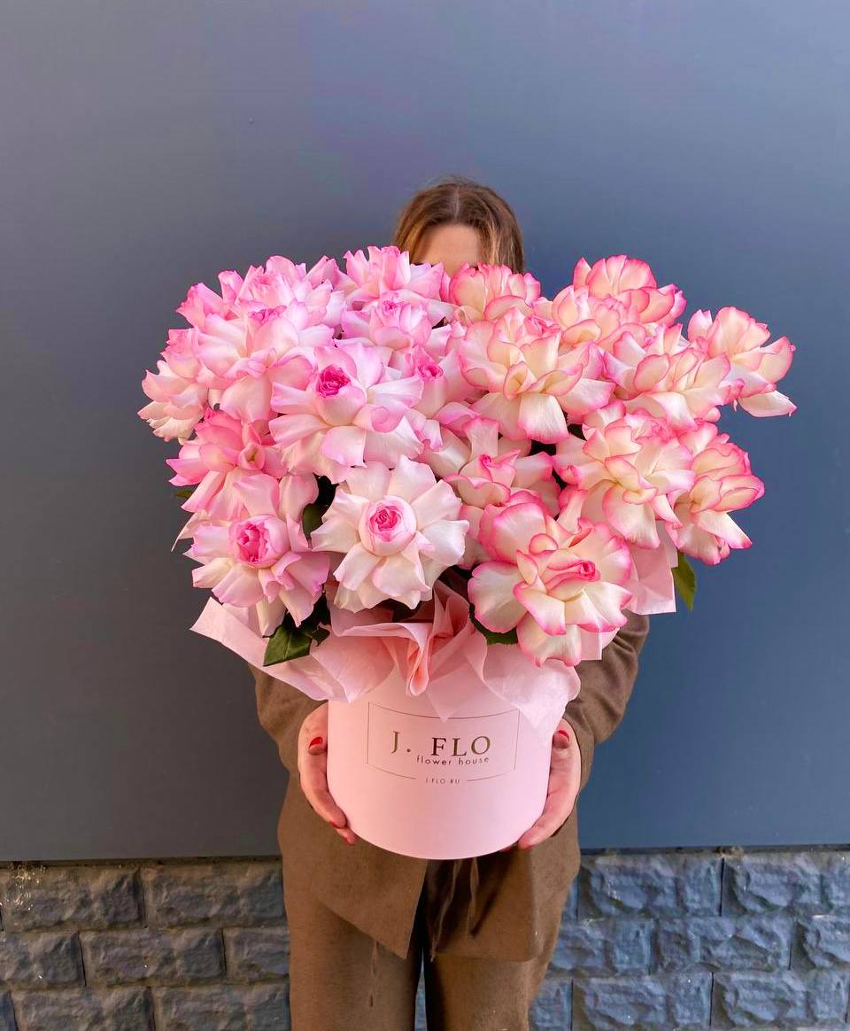 Воздушная композиция в пастельной гамме с акцентом на фактуру раскрытых бутонов. Пионовидные розы и эустома создают объёмный силуэт, а хлопок добавляет графичности.