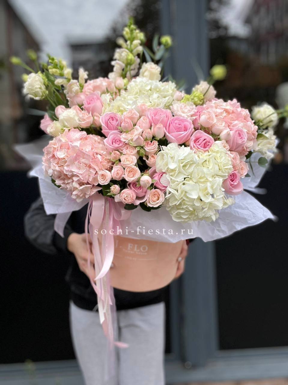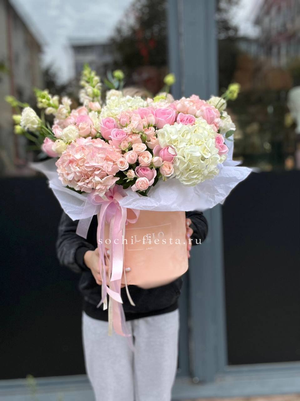 гортензии, эустома, розы, бомбастик, эвкалипт, антиринум в боксе 25.