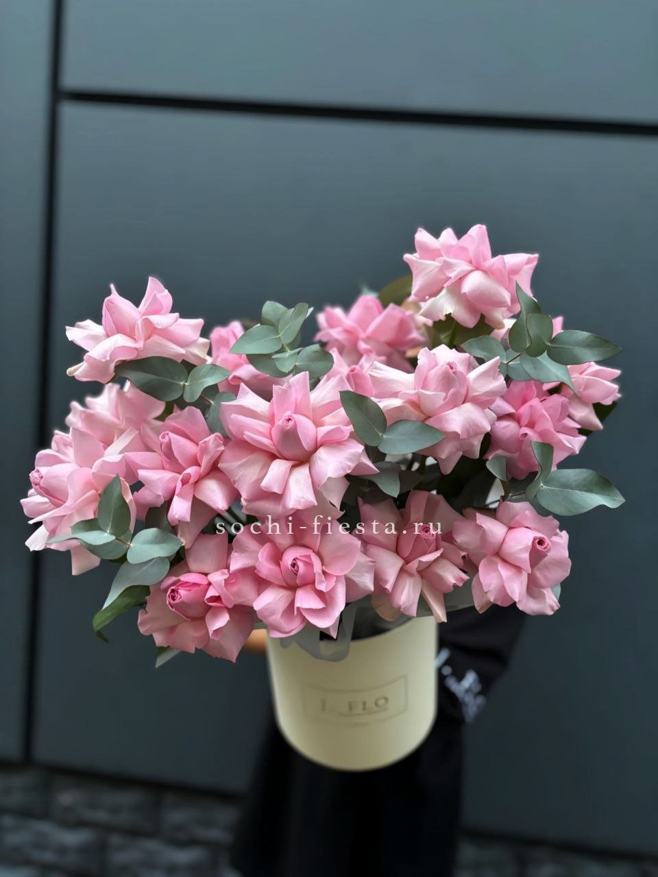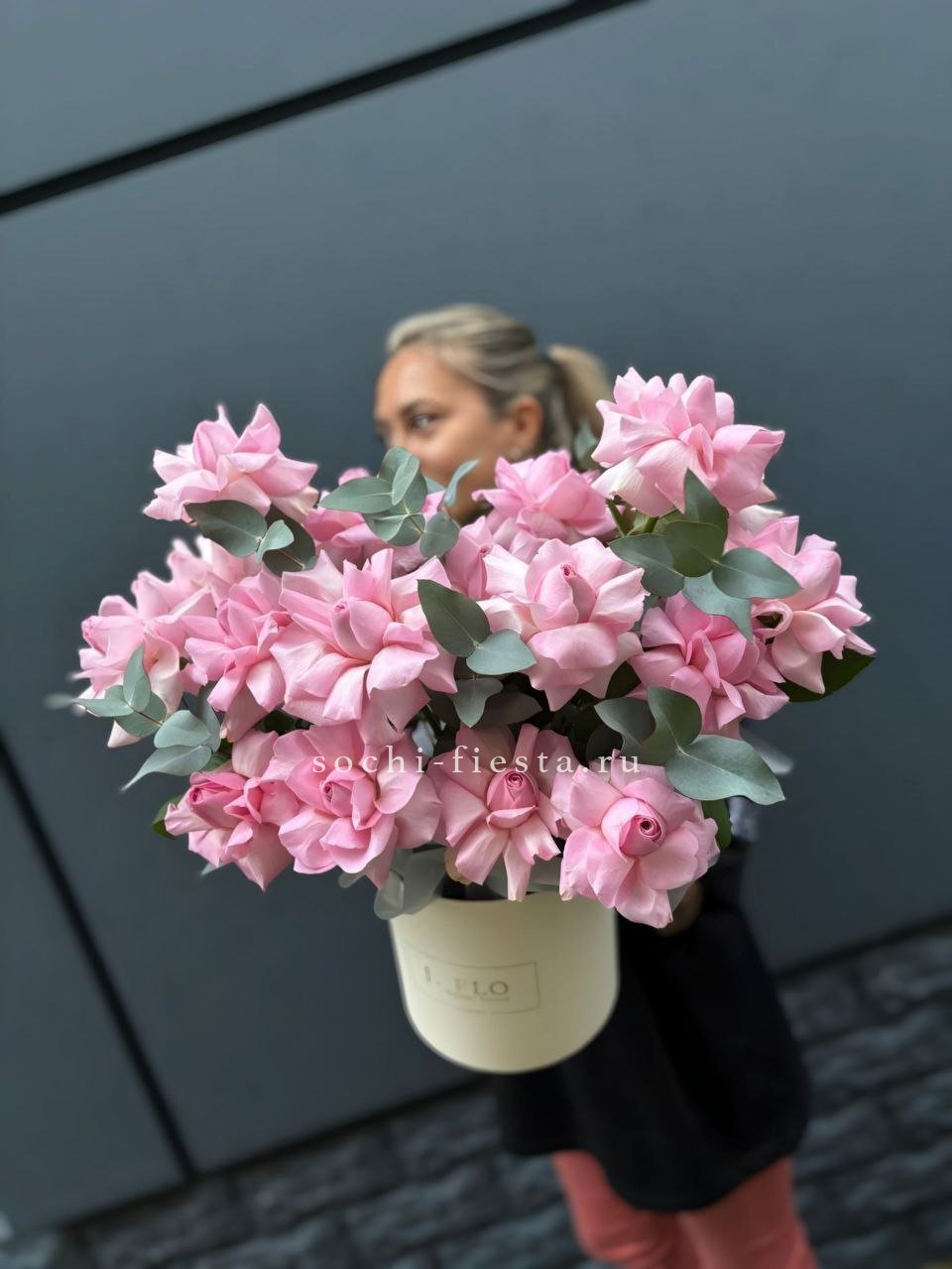 красная и розовая роза, озатамус, диантус, мисти баблс, эвкалипт, бокс 20.