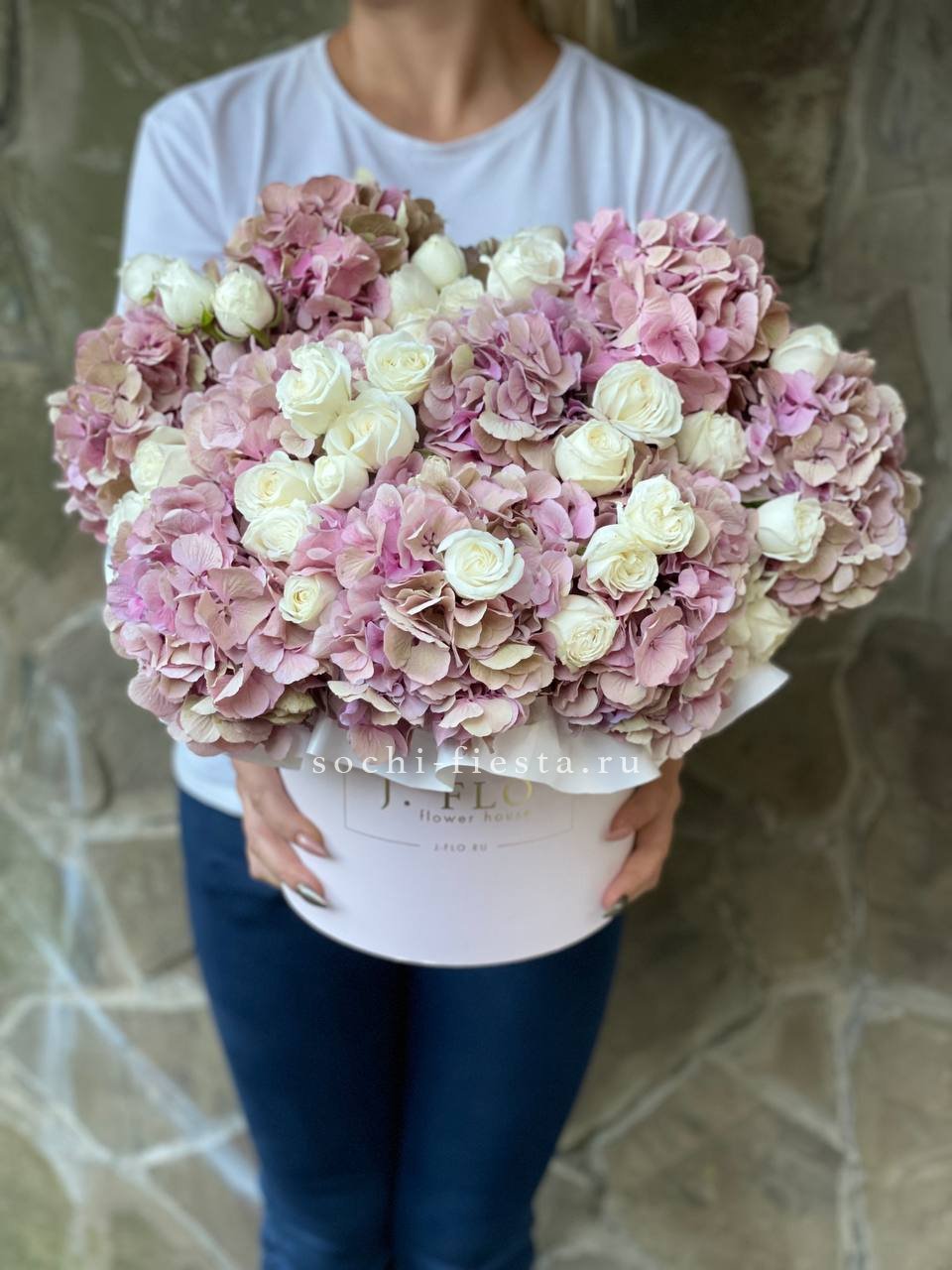 Пышная гортензия сплетается с воздушными кустовыми розами в объёмной шляпной коробке. Мягкие оттенки и многослойная фактура создают ощущение лёгкости и свободы. Композиция занимает пространство уверенно и непринуждённо.