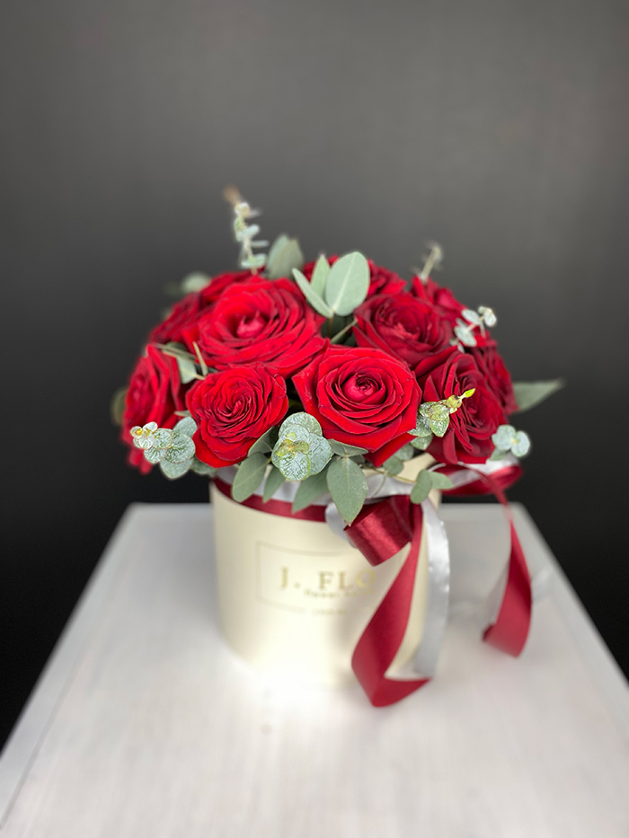 французские розы, кустовые розы джульетта, хлопок,  амарантус, зефирный цилиндр D13, эвкалипт, лента, упаковка.