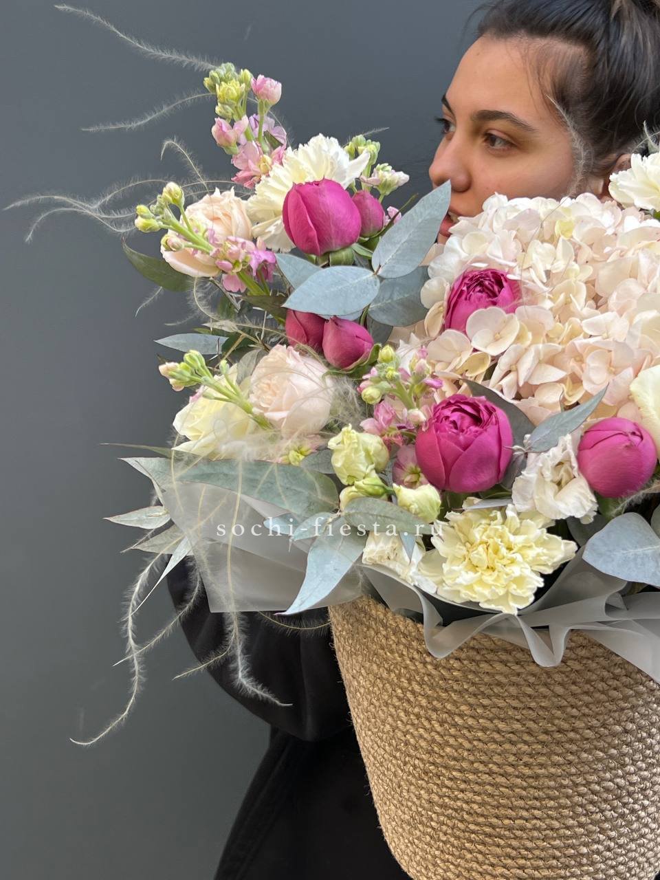 маттиола, французские розы, кустовые пионовидные розы, дианутсы, амарантус.