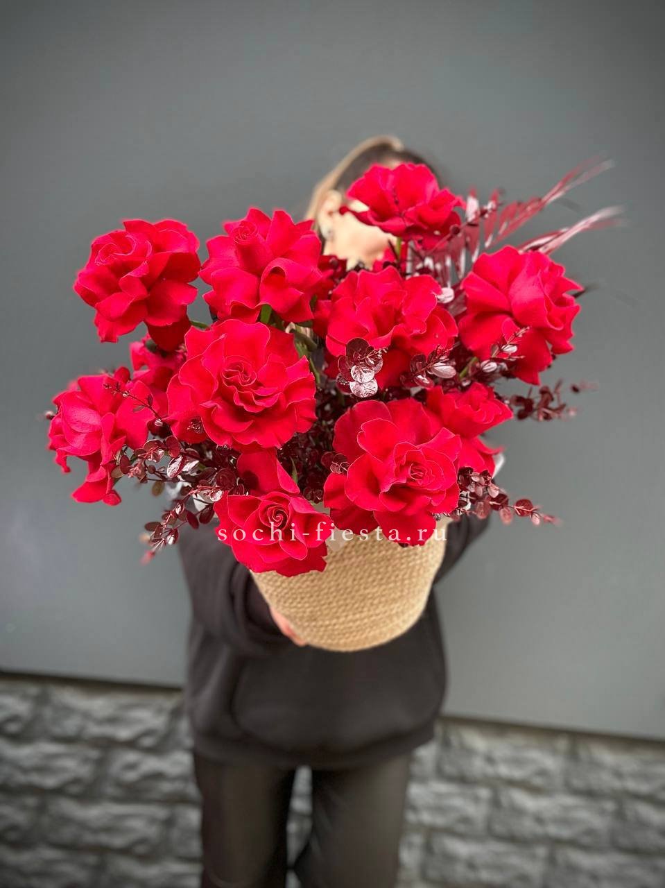 красная роза, бомбастик, лагурус, золотой эвкалипт, джутовое кашпо.