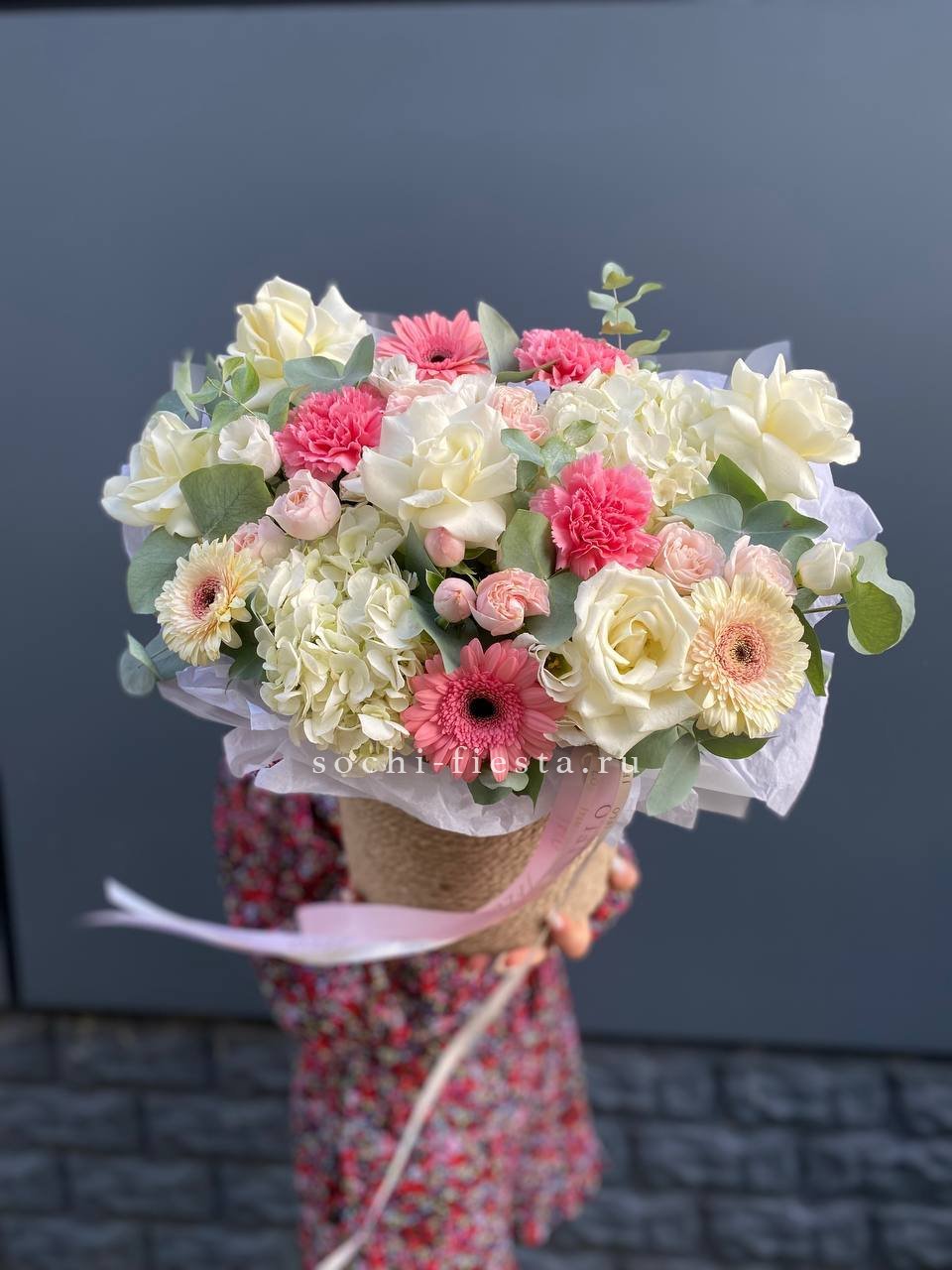 пионовидные розы Мисти Бабблс, джутовое кашпо, стифа, эвкалипт.