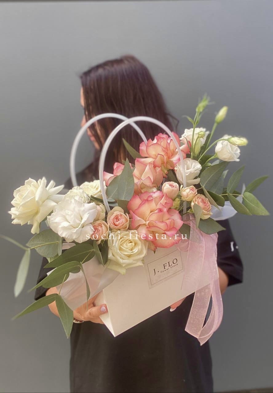 хризантема голубая, лагурус, сумочка.