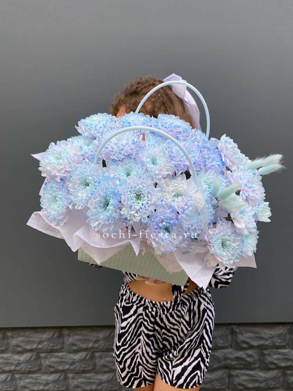 Голубая хризантема в компании воздушного лагуруса напоминает о прохладе летнего утра. Компактная форма в сумочке позволяет разместить цветы на столе или полке без лишних усилий.