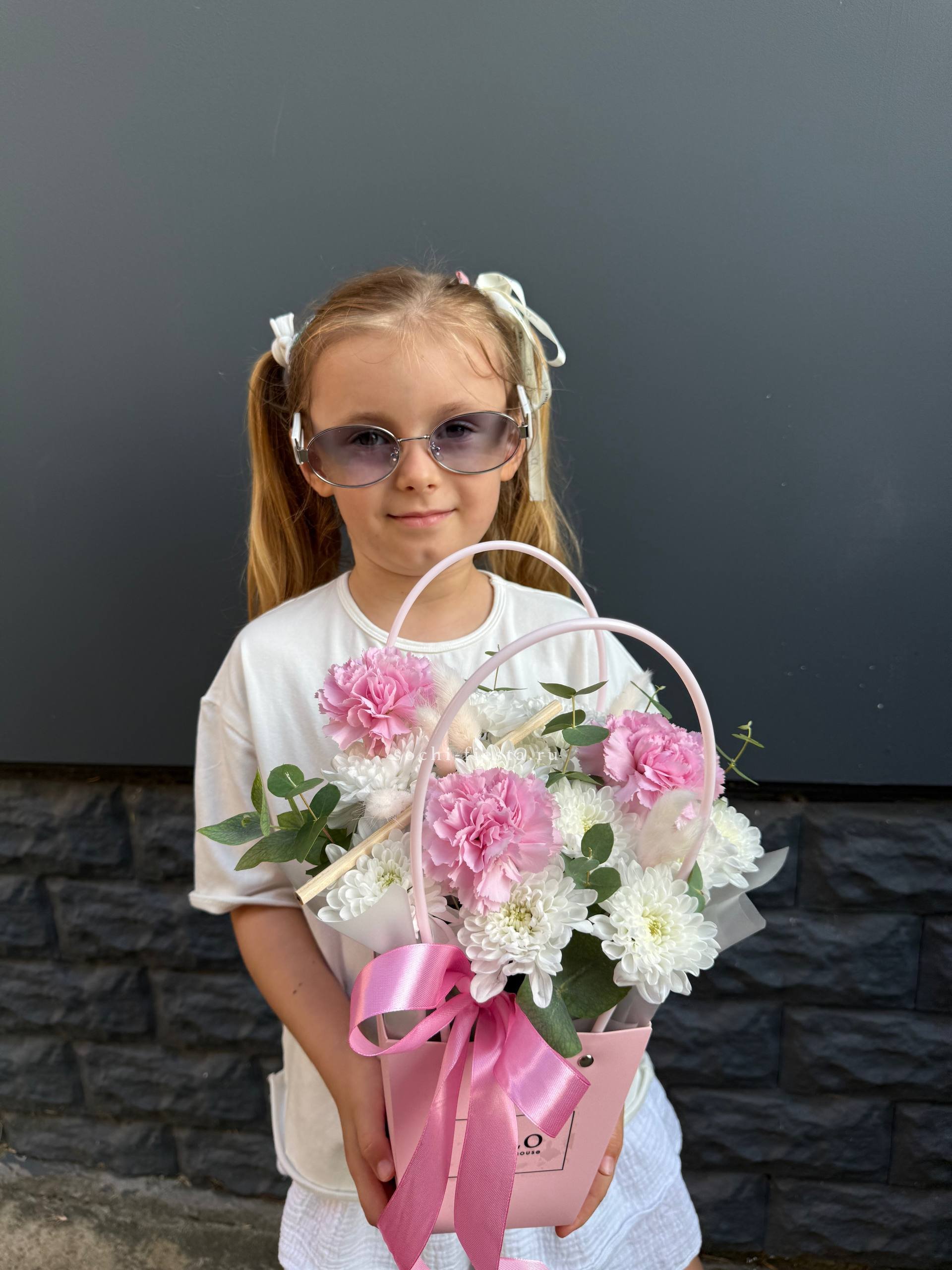 Хризантемы и диантус в удобной сумочке держат форму долго и выглядят свежо несколько дней. Лагурус добавляет текстуры, а эвкалипт дополняет композицию природной естественностью.