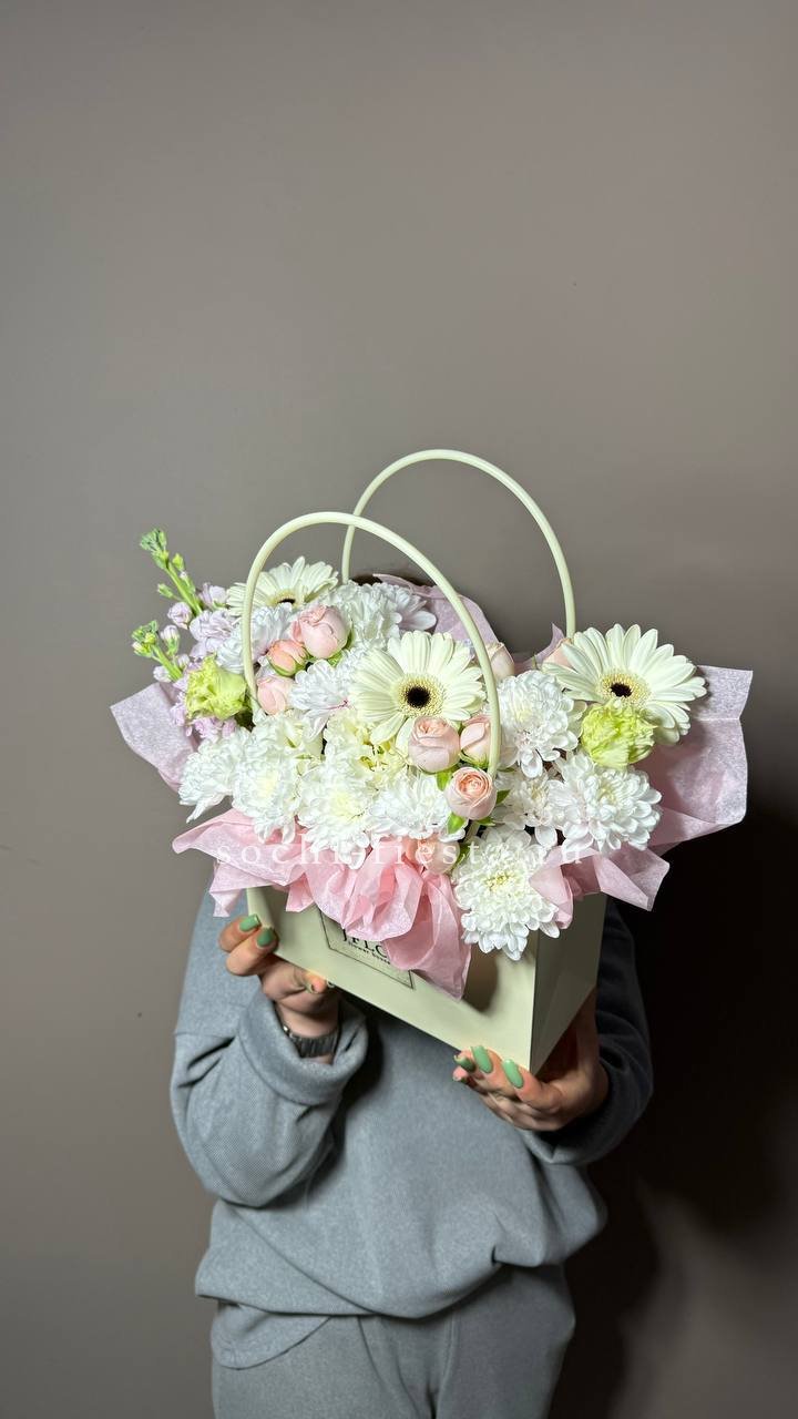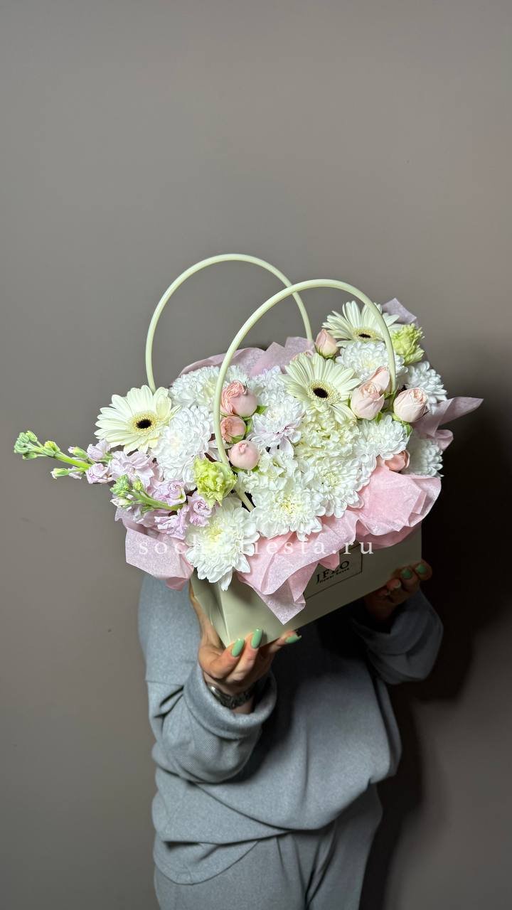 Розовые розы и диантусы переплетаются с кустовыми хризантемами в плотной округлой композиции. Альстромерия добавляет графичные акценты между бутонами. Сумочка собирает все элементы в аккуратную форму с естественным объёмом.