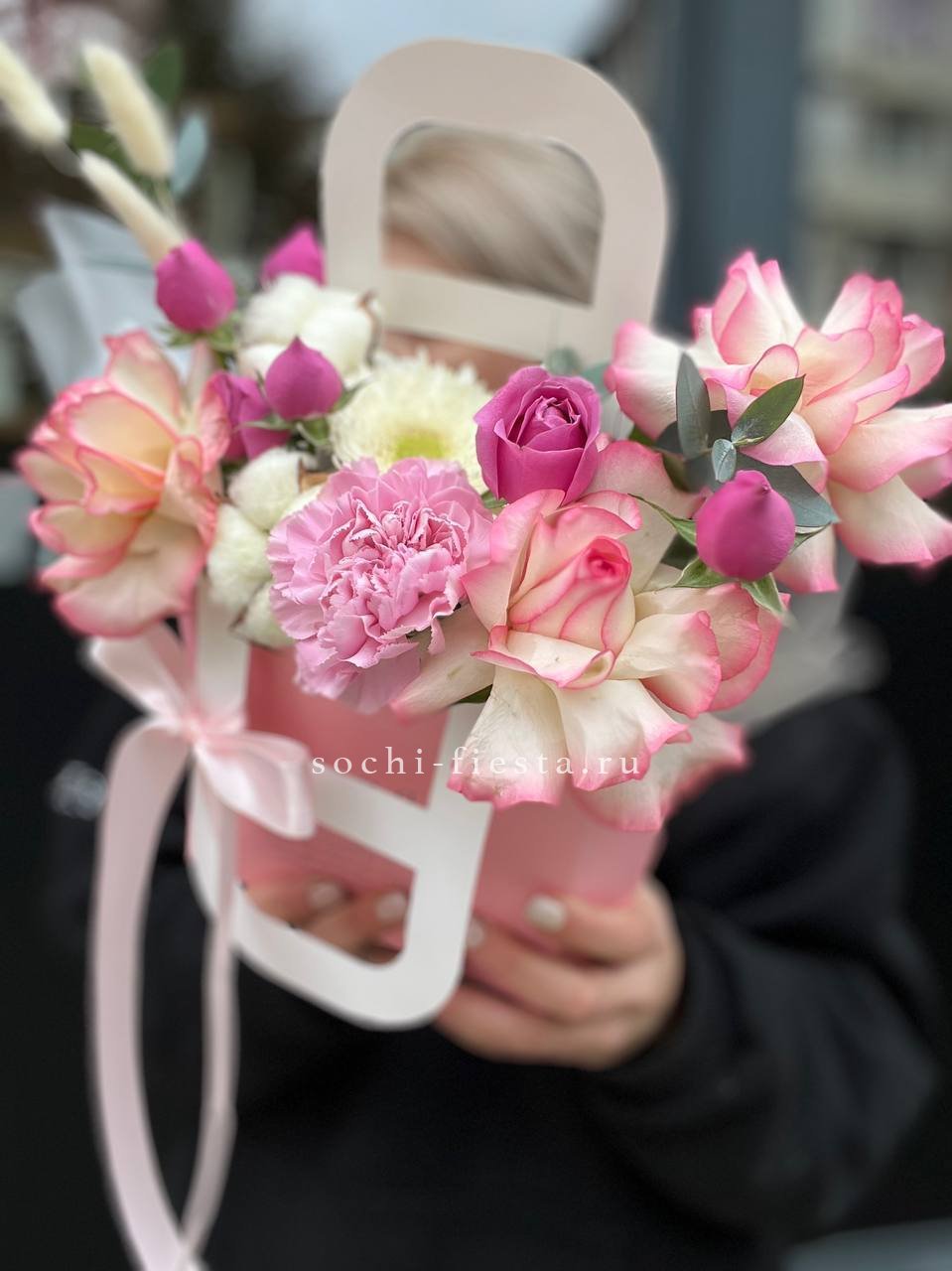 Яркая композиция в удобной сумочке объединяет розы Джумилия с герберами и воздушными соцветиями. Хлопок и лагурус добавляют природной легкости, а диантус создает цветовую динамику.