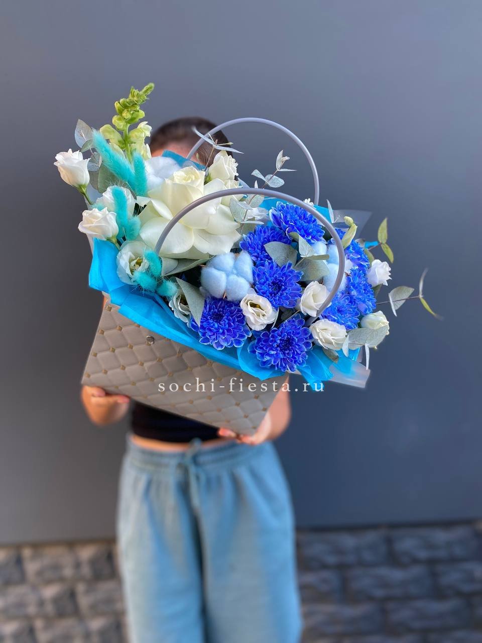 Белые розы и хризантемы сочетаются с воздушной эустомой и хлопком в сумочке. Светлая гамма с прохладным оттенком напоминает морскую свежесть и создает спокойное настроение.